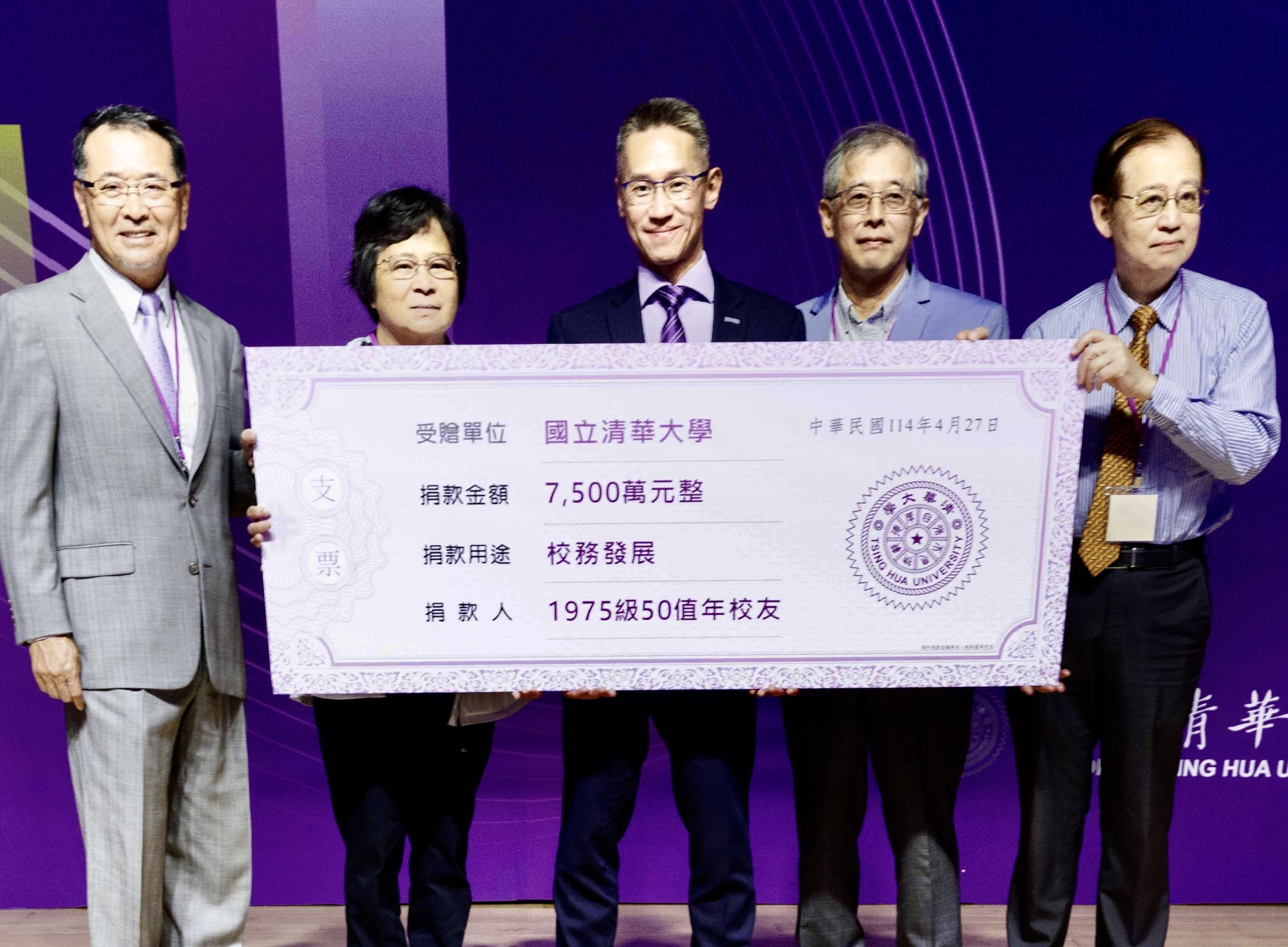 畢業50年的1975級核工、物理、化學、數學系所校友代表一同在校慶大會上,將4系校友合力募得的7,500萬元捐贈給母校,展現對清華深厚的情感與支持。