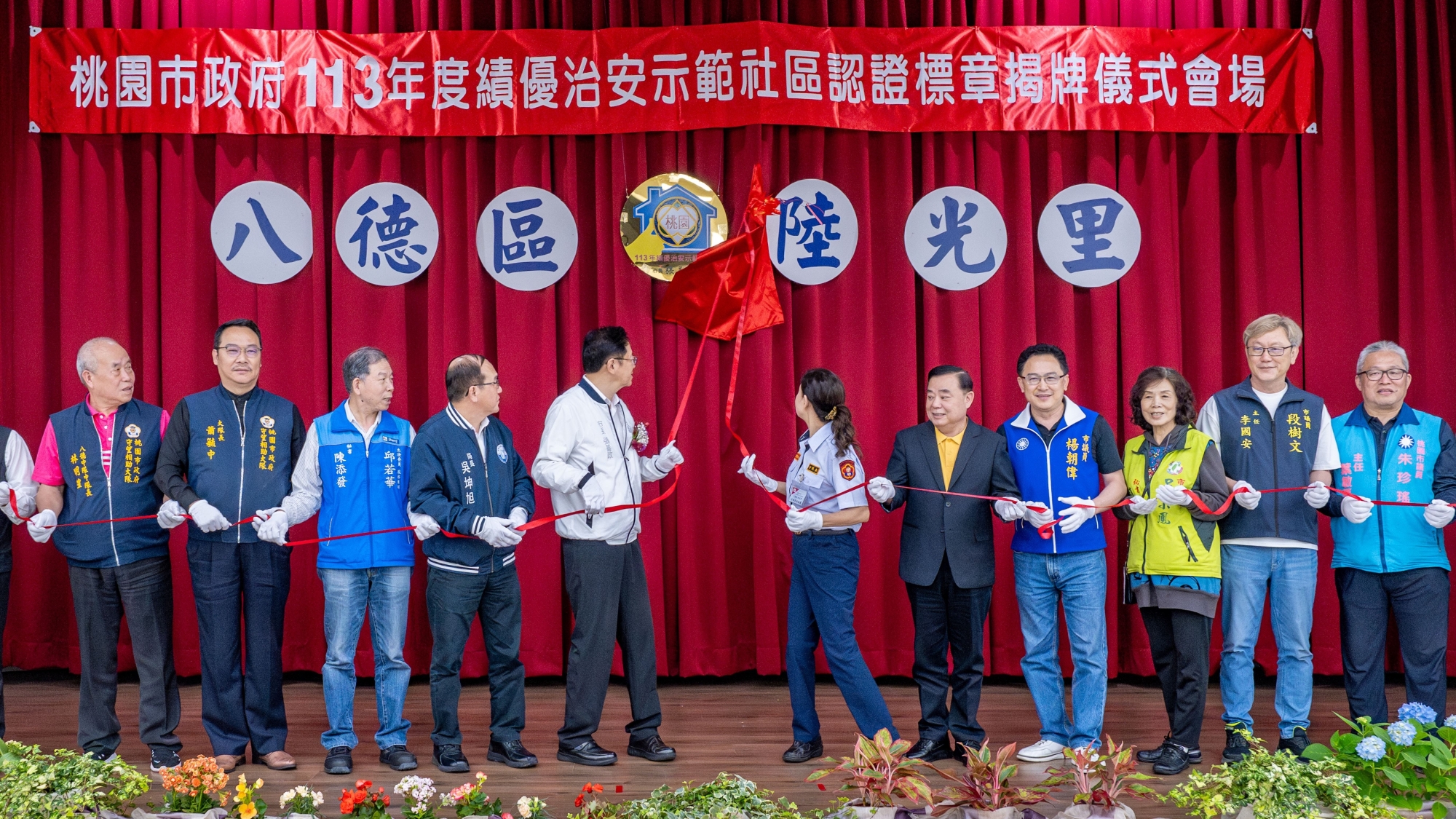 桃園市長張善政今(28)日下午前往八德區陸光里,出席「113年績優治安社區認證標章頒獎典禮」。張市長表示,陸光里自投入守望相助工作以來,展現高度投入與努力,3次參加評選,3次都獲得績優治安示範社區認證標章,讓社區治安維持穩定,感謝所有協勤夥伴的辛勞付出。