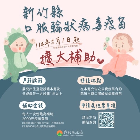 縣長楊文科致力打造年輕人「願生樂養」的環境,持續減輕爸媽的育兒負擔。今年5月1日起擴大口服輪狀病毒疫苗補助對象,8個月內新生兒出生登記至申請期間均設籍新竹縣,且父或母任一方設籍新竹縣1年以上,就可持兒童健康手冊前往縣轄公費疫苗認定合約醫療院所,由專業醫師評估身體狀況後施打口服輪狀疫苗。