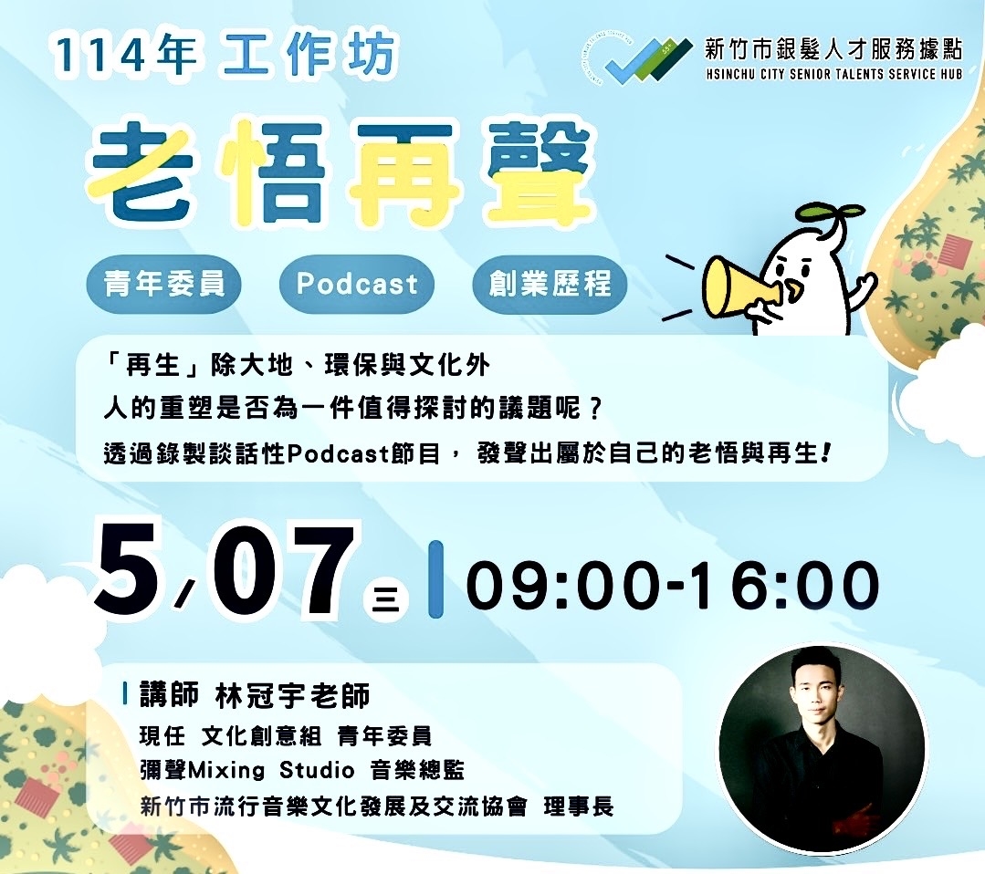 5月7日(三)09:00–16:00在新竹市銀髮人才服務據點,新竹市龍山西路99號4樓 學科教室免費參加・名額有限・報名從速!立即報名(附上報名連結)