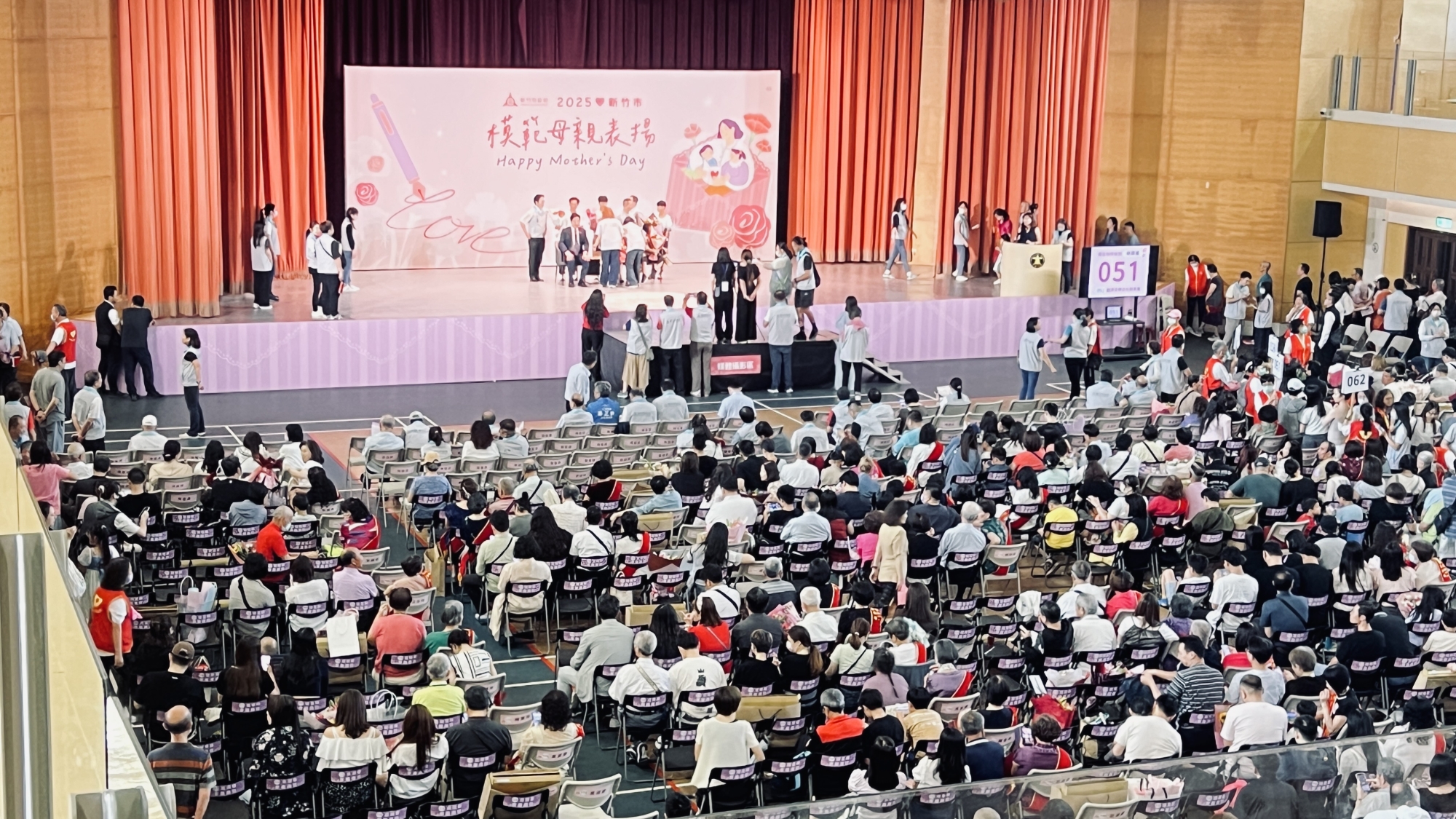 五月的風吹開了康乃馨!竹市表揚模範母親,熱熱鬧鬧歡聚一堂,一一排隊個別和市長合影留念,整個表揚大會,花了三個多小時,會場恢復平靜。