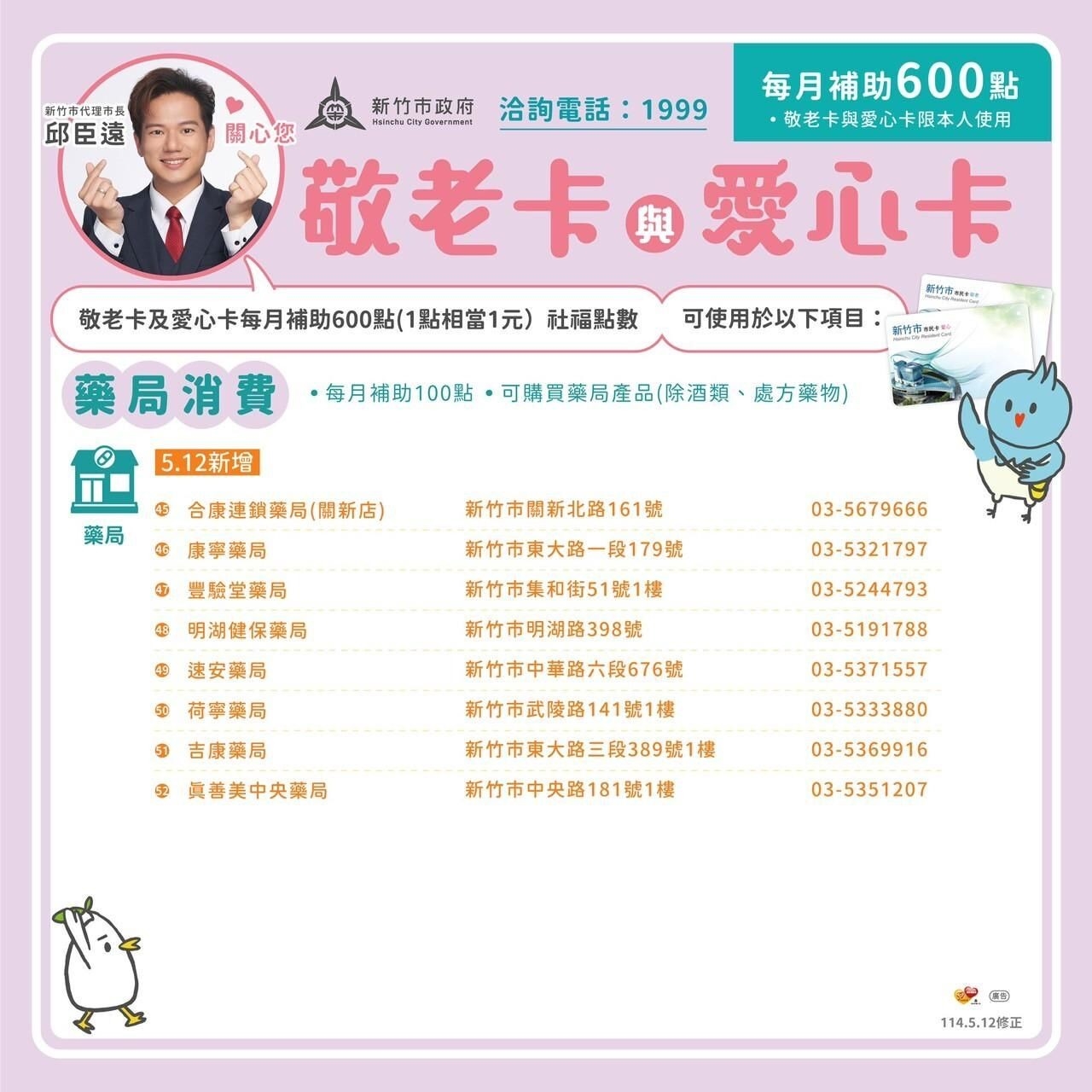 為加速藥局佈建,市府推出補助合作藥局所需的設備費用,輔導建置系統,讓更多藥局有意願投入敬老卡及愛心卡的服務,未來也將持續擴增合作藥局。竹市府持續擴增敬老卡及愛心卡使用項目,讓敬老卡及愛心卡更加好用又便利。