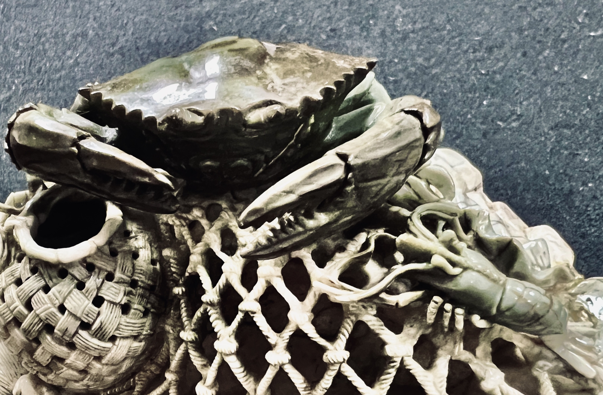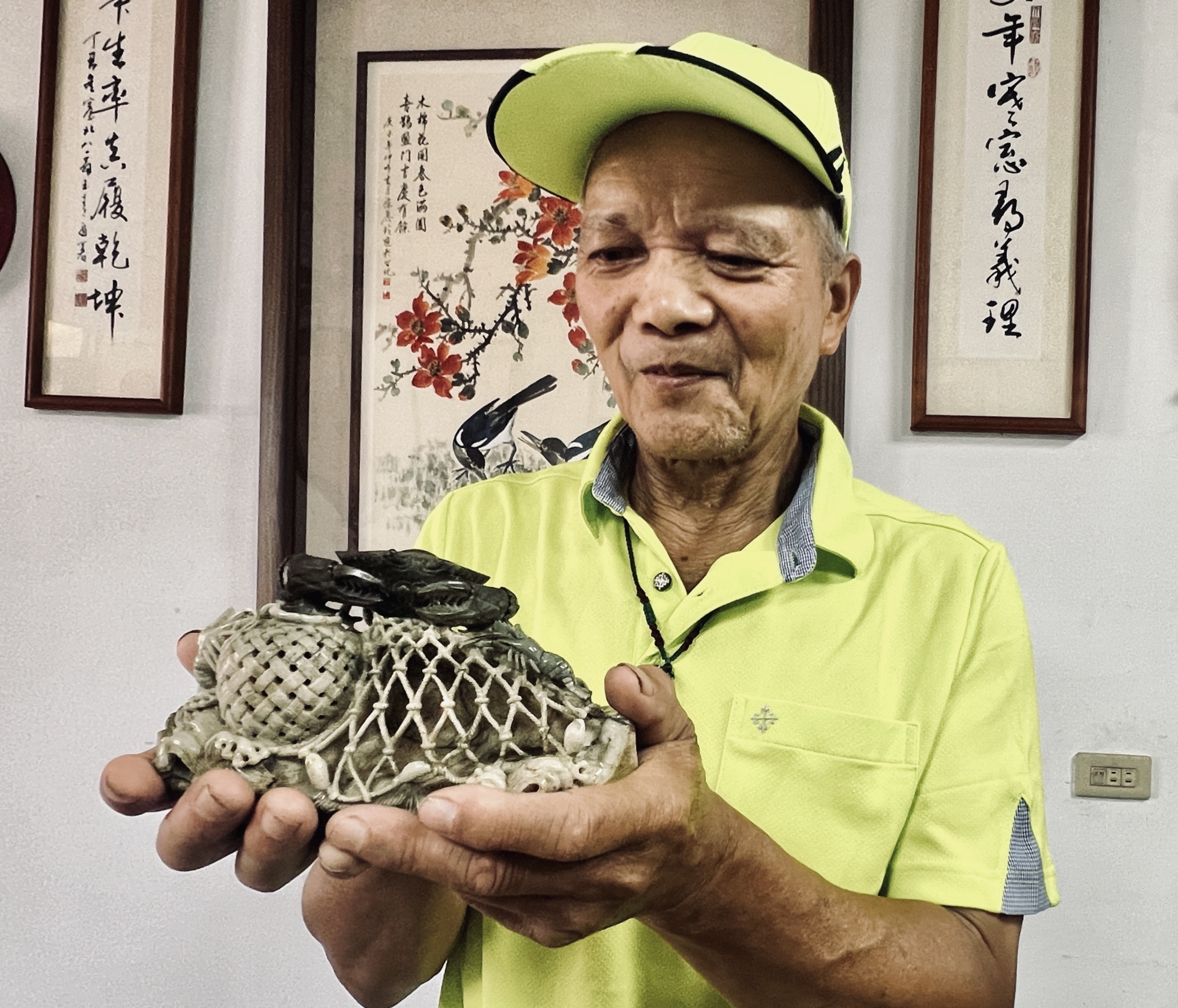 從河床邊撿來的不起眼石頭,竟能經慧眼與巧手,幻化為藝術瑰寶。最讓人驚艷的,莫過於那件名為〈一網情深〉的作品——石頭上天然的綠與巧雕相結合,螃蟹活靈活現,彷彿下一秒就要橫著爬出來。