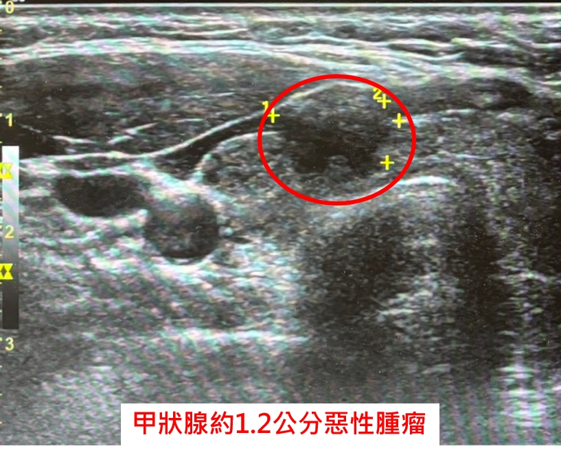 一名48歲的女性患者,健檢時發現有甲狀腺節結,求診中國醫藥大學新竹附設醫院一般外科古君平醫師,經過約兩年的定期追蹤,去年發現約有1.2公分惡性腫瘤,被診斷為甲狀腺癌第一期。