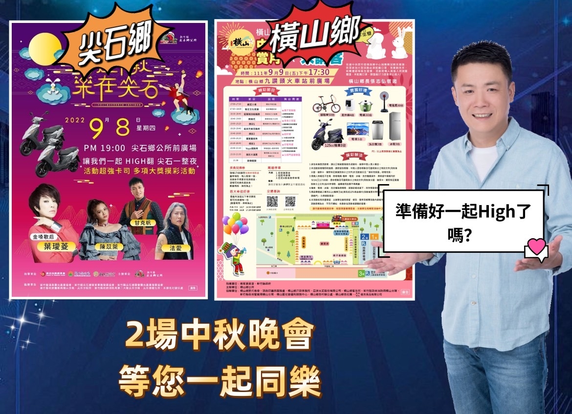 尖石鄉是9月8日星期四下午16:00到晚上22:00,在尖石鄉公所前廣場舉辦,張良印提醒鄉親別忘了19:00以前要在各村領摸彩券及文旦1顆(限量送完為止);晚會活動請到金嗓天后葉璦菱、泰雅美聲陳苡萊、深情王子甘克帆、法愛等知名歌手,現場還有客家及原住民的精彩表演,以及泰雅美食攤位設置,歡迎大家一起嗨翻天。