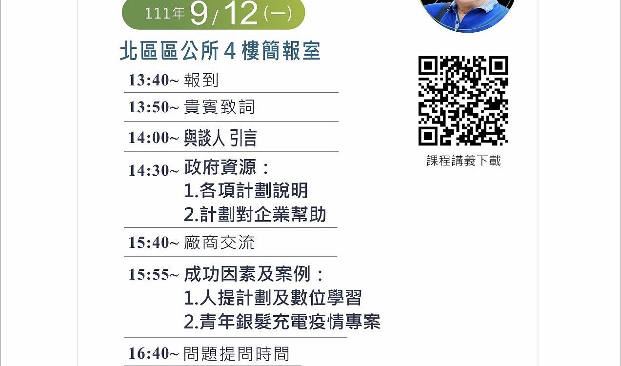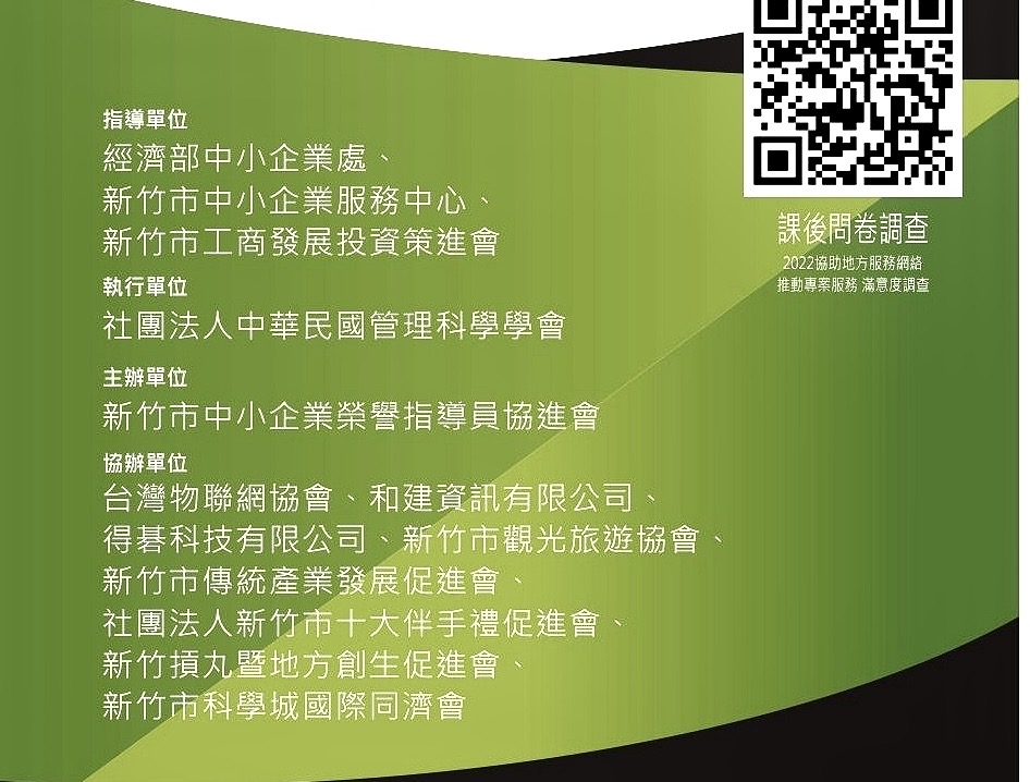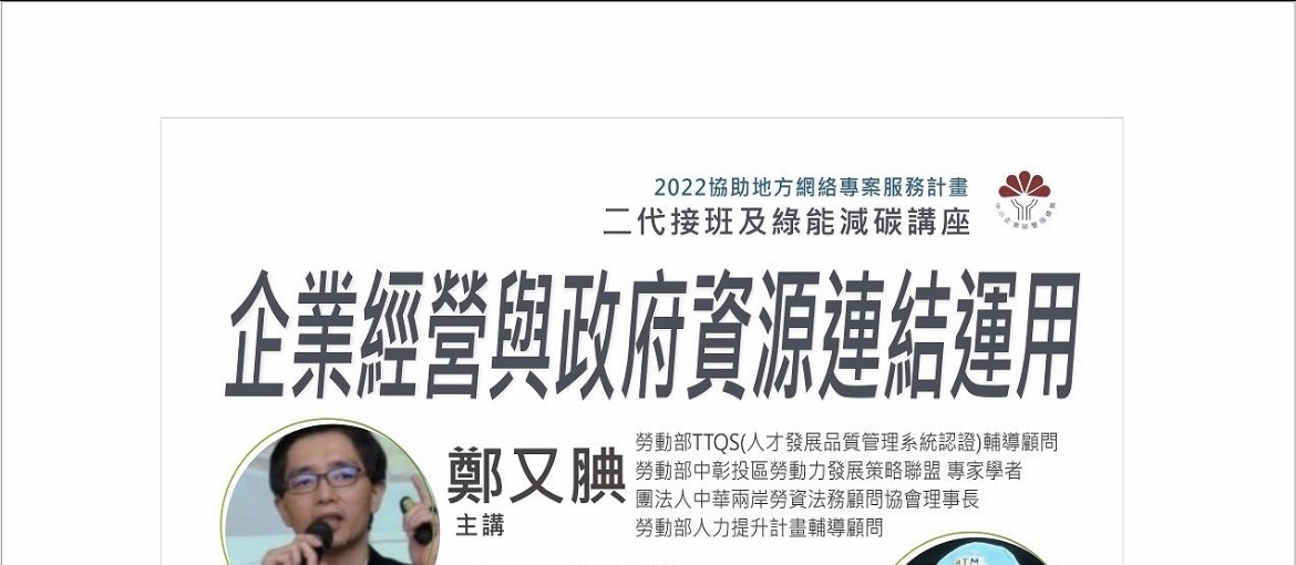 2022協助地方網絡專案服務計畫,二代接班及綠能減碳經營知能研討交流,111年9月12日(星期一)下午13:40~17:00,在新竹市北區區公所4樓簡報室舉辦「企業經營與政府資源連結運用」講座,勞動部TQS人才發展品質管理系統認證輔導顧問鄭又腆主講,全程免費、備有餐盒,歡迎踴躍參加。