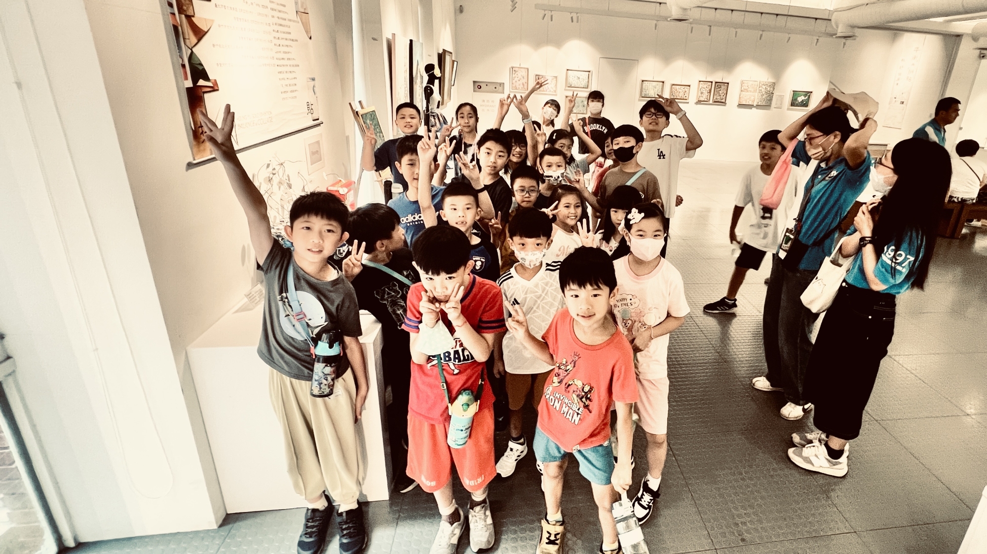 「平衡」與「拼貼」出現在美術館寬敞B1展廳,亮麗精神作品吸引觀眾駐足觀賞,成群小朋友觀眾,對畫作感到生趣,尤其對翻轉畫框藝品產生好奇,增添觀賞學習藝術畫作誘因。