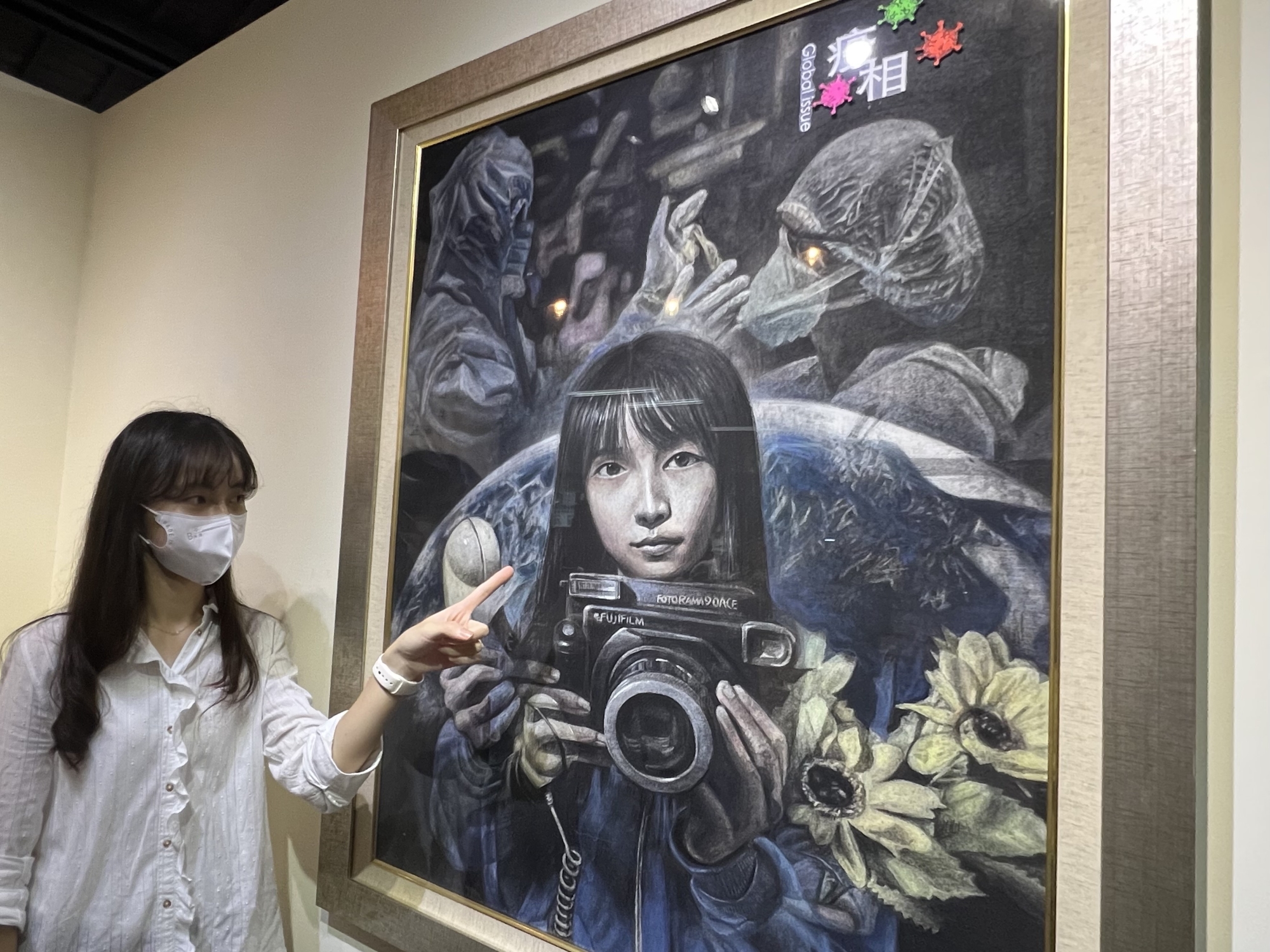 蕭恩霈同學把自己帶入畫作,以寫實「疫相」呈現的作品 何致遠攝