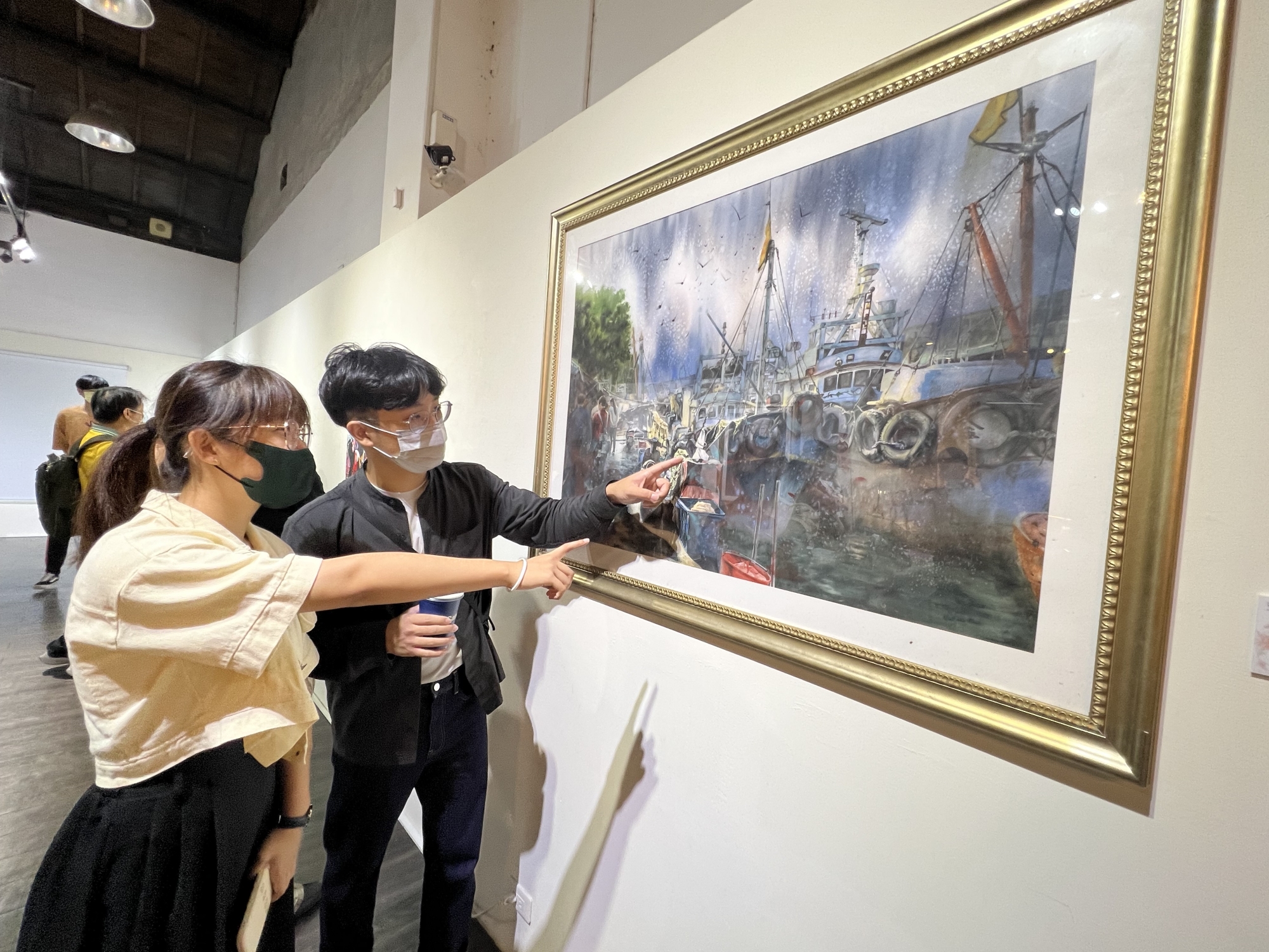 羅珈羽同學的「回首」和「港情」,兩幅大畫尺寸作氣勢不凡,在港情畫作裡,勾勒了交錯複雜的港邊情懷,以聚焦的渲染和潑灑技巧,帶出一抹午後的閒適感。