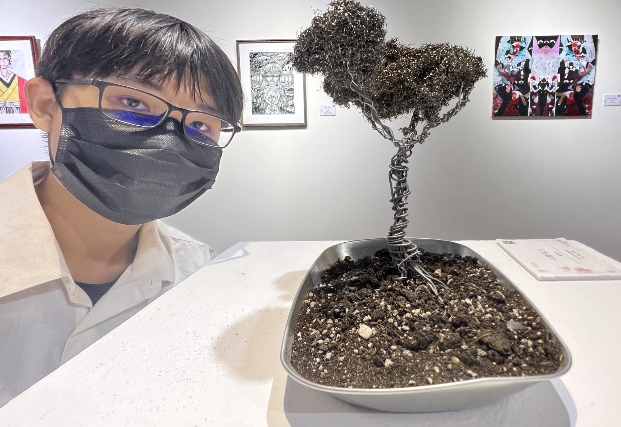 曾淯辰同學作品設計訴求環保議題,以「廢品」為標題,表達曾經是垃圾的廢金屬,重生成一棵樹。