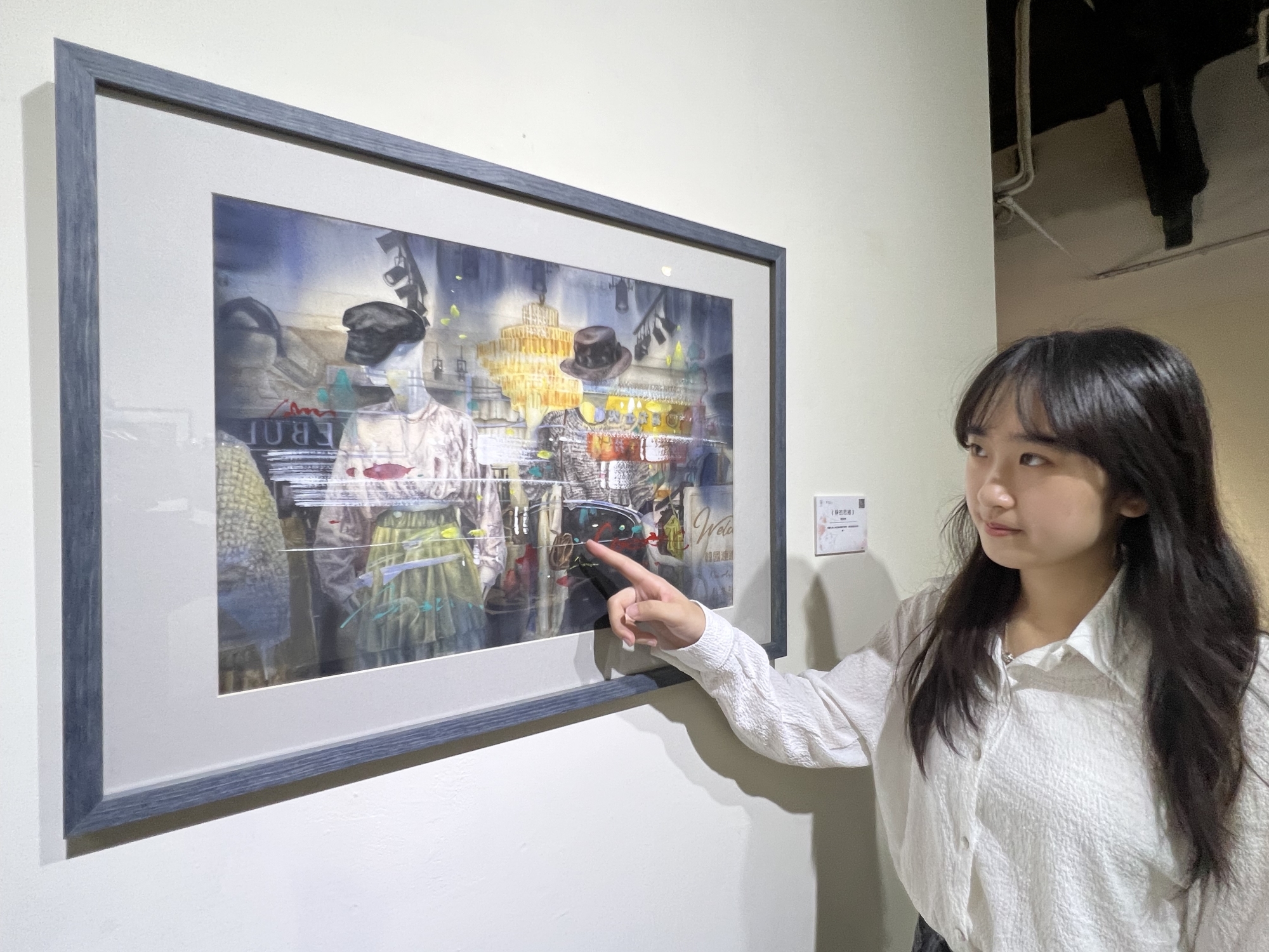 楊詠婷同學以多層次表現創作,在「靜的思緒」畫題裡,點亮華麗的燈光搭配櫥窗的模特,倒映著悠悠思緒。