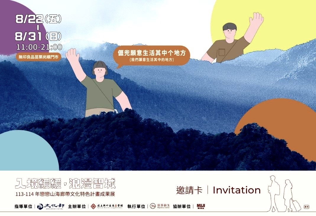 文化部所屬國立新竹生活美學館,籌辦「113-114年戀戀山海廊帶文化特色計畫」,鏈結15組新竹苗栗團隊,共同發展竹竹苗「入境緩緩」廊帶跨域遊程。二年的成果展於22日(五)上午10:30,在苗栗縣頭份市育樂街8號3樓MUJI無印良品苗栗尚順門市開展。