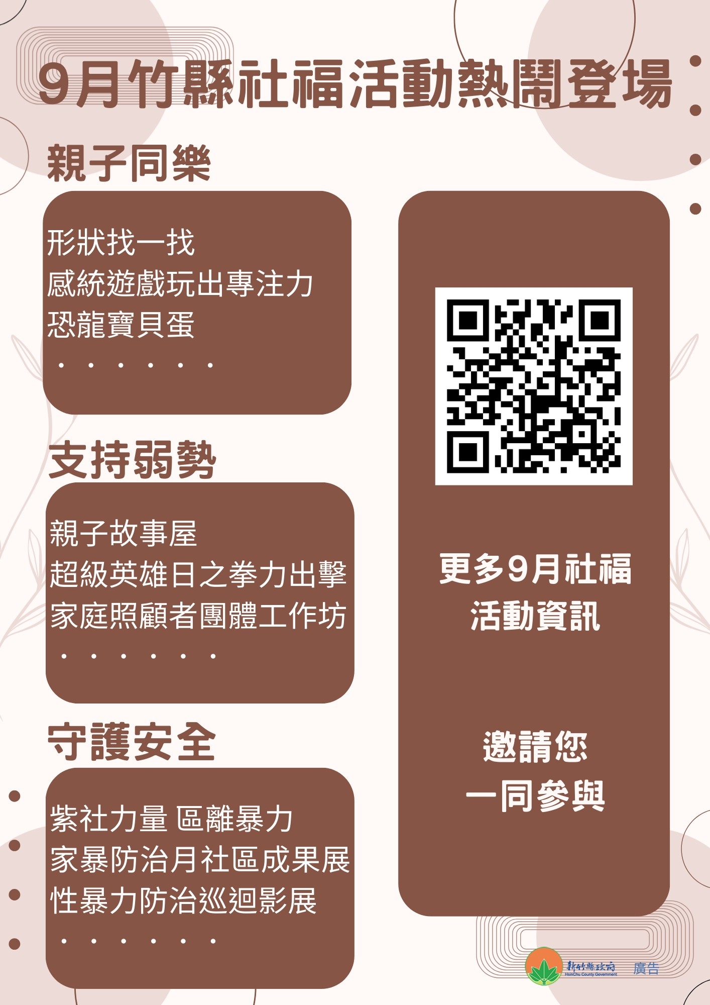 秋意漸濃,新竹縣政府社會處持續推動友善家庭與全民共享的生活環境,特別推出「竹縣9月社福 樂享幸福秋日時光」系列活動,精心規劃超過30場涵蓋各年齡層的親子與大眾福利活動,內容豐富多元,包括親子共學、手作體驗等,邀請縣民一同參與,在秋日裡感受溫暖與幸福。