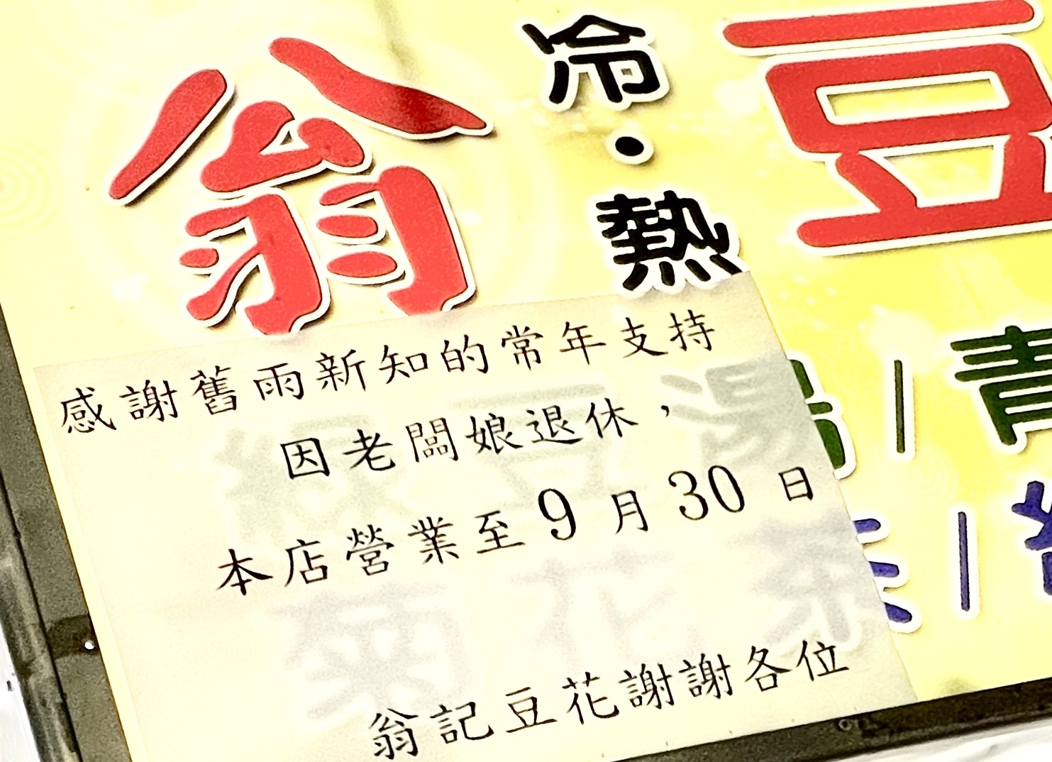 時間一晃四十六個年頭,上午十一點到晚上十一鐘擺夜市日子,悄悄溜走,翁記豆花要邁向半百歲月時刻,豆花西施經年累月低頭彎腰舀豆花,防慢性職業病痛,已經竟日繃帶纏腰,常感力不從心,沒有力氣再起早趕晚,而且房租壓力和營收已經不成比例,決定殺青這部夜市人生戲碼,不再趕翁記豆花片場,9月30日向幾十年來支持者深深鞠躬謝幕。