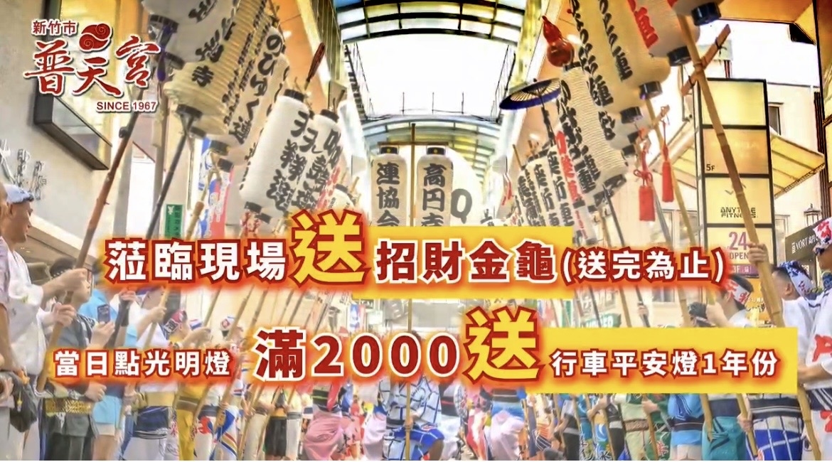 當日到普天宮點光明燈,滿2000,送行車平安燈1年份,現場贈招財金龜(送完為止)。