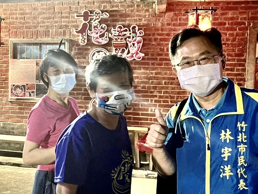 竹北市代林宇洋(右)新瓦屋客家花鼓隊加油鼓勵 何高祿攝
