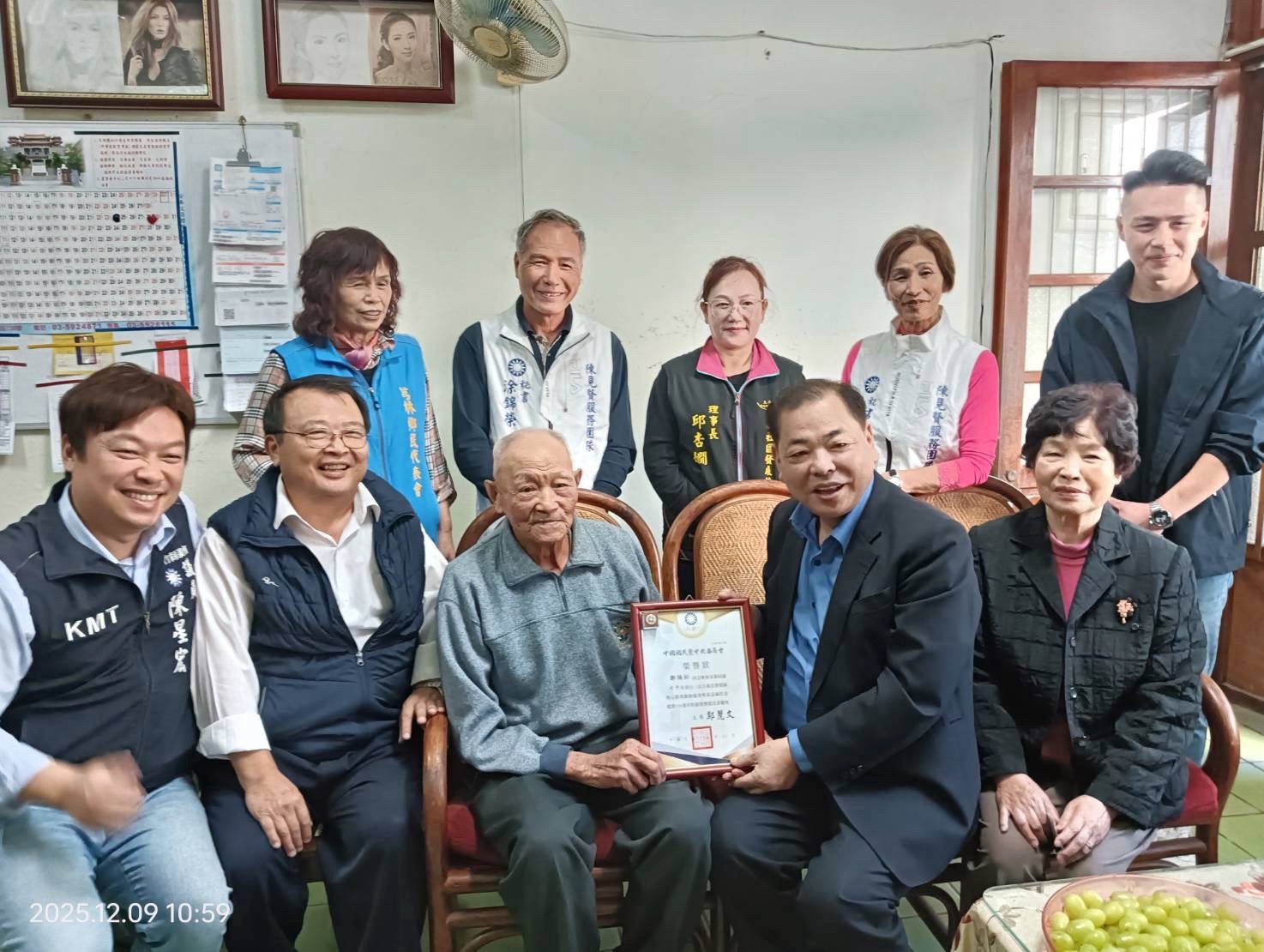 國民黨新竹縣黨部9日前往芎林鄉舉辦晉齡黨員表揚活動,由縣黨部主委陳見賢親自頒發獎狀,向黨齡高達 70 年的芎林鄉鄭煥松老師致敬。