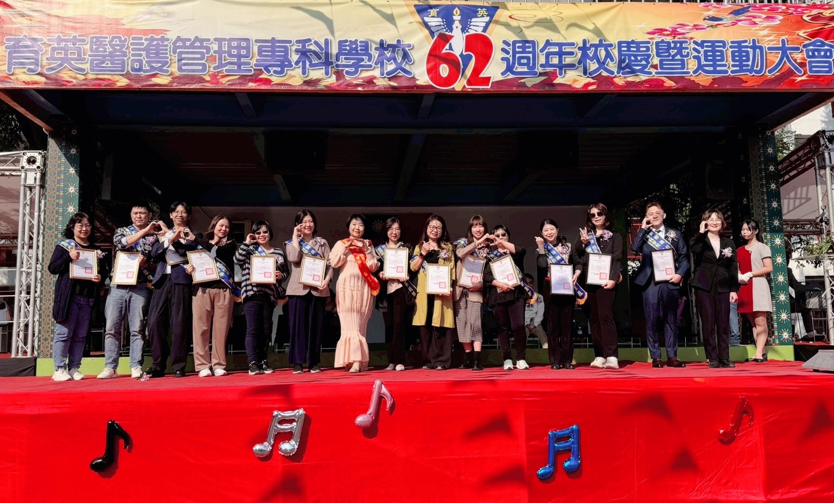 育英醫護管理專科學校於今日舉辦創校 62 週年校慶典禮,現場陽光普照、氣氛熱烈。在司令台中央就座的知名藝術家、育英校友施雪紅,見證母校校慶盛況,難掩感動與喜悅。