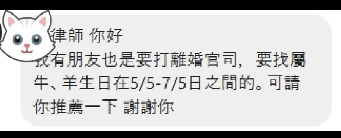 一名女性要委任律師打離婚官司,竟然要求律師「生肖屬牛或羊,生日介於 05/05至07/05之間。」等條件。(翻攝徐宏澤臉書)