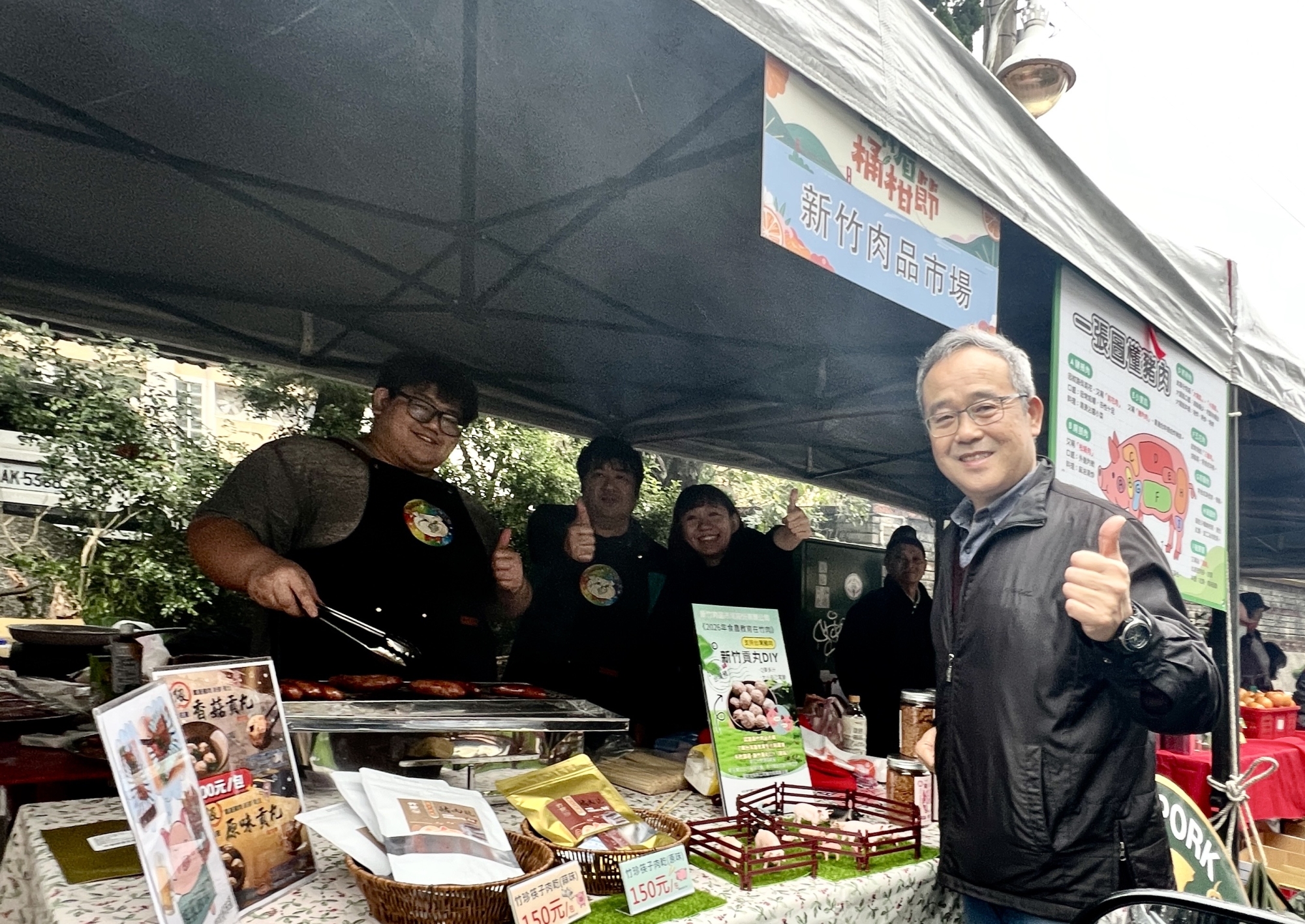新竹肉品市場為桶柑節加溫,在現場設烤香腸攤位,增添熱鬧氣氛,總經理詹皓智親自督陣,為遠到支持的團隊鼓勵打氣。