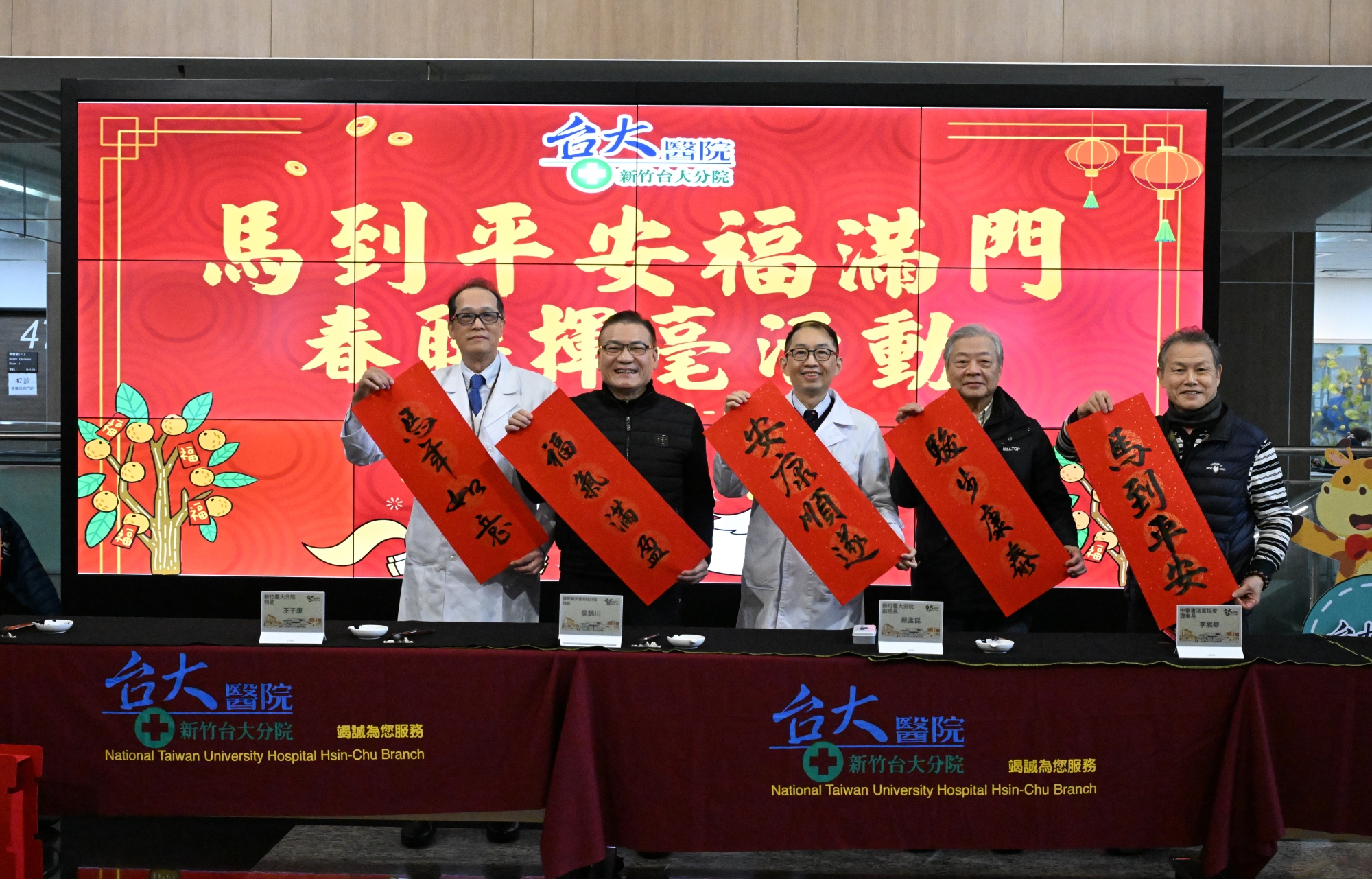 春節將近,新竹臺大分院於春節前夕舉辦「馬到平安福滿門」書法揮毫活動,現場人潮絡繹不絕,病人、家屬、社區民眾及醫院同仁依序排隊等候索取春聯,在紅紙與墨香交織下,院區呈現年節前熱鬧而有序的氛圍,洋溢溫馨的新春氣息。