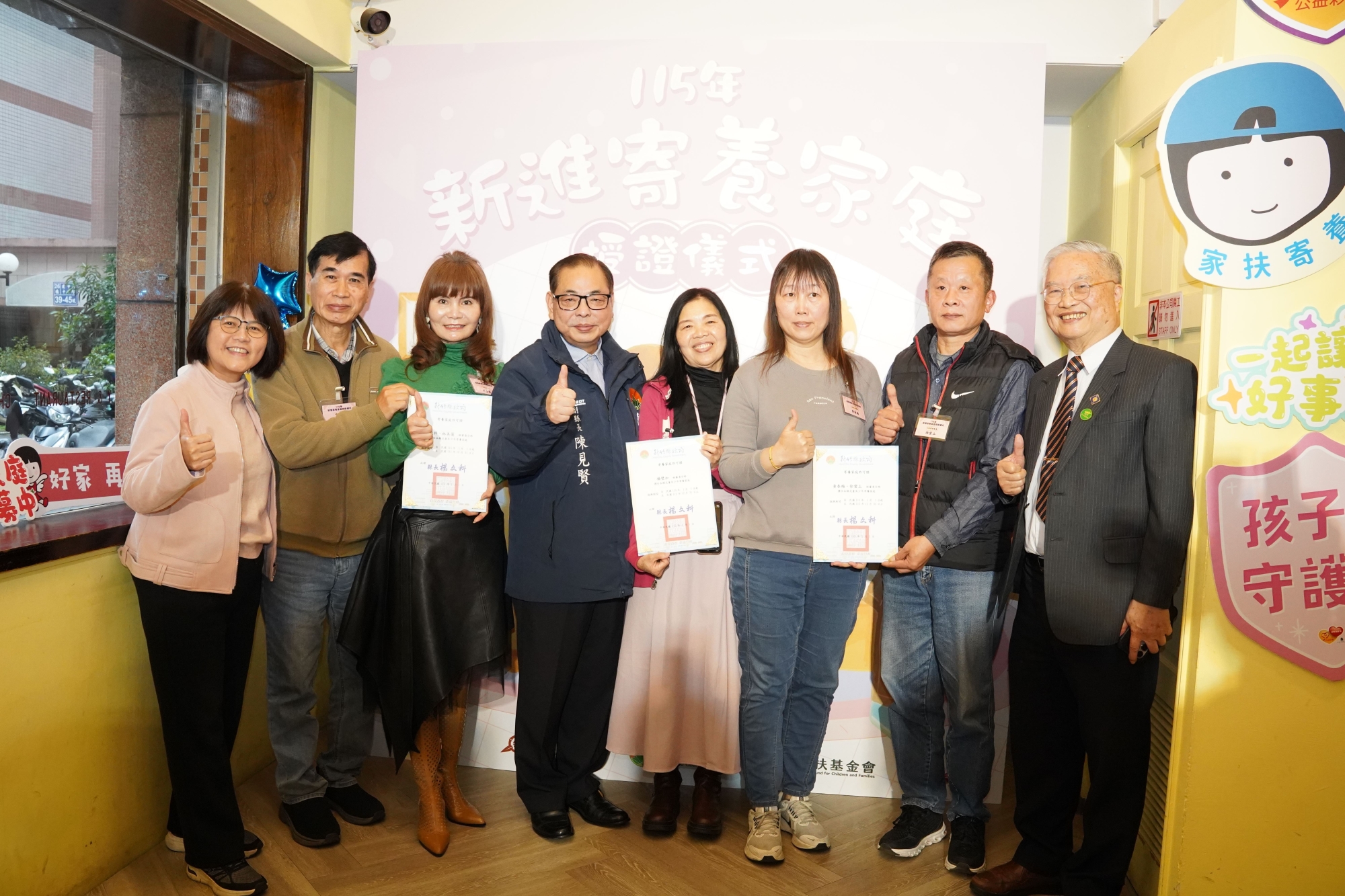 為了給失依兒少一個溫暖的港灣,新竹縣、市政府今(2日)共同舉辦「115年度新進寄養家庭授證典禮」,由新竹縣副縣長陳見賢及新竹市長高虹安共同授證,新竹市副市長邱臣遠、新竹家扶中心扶幼主委詹金興,一起迎接4戶新進寄養家庭加入服務行列,感謝寄養家庭願意張開雙臂,以愛與陪伴守護新竹地區的孩子,成為他們生命中重建希望的重要力量。