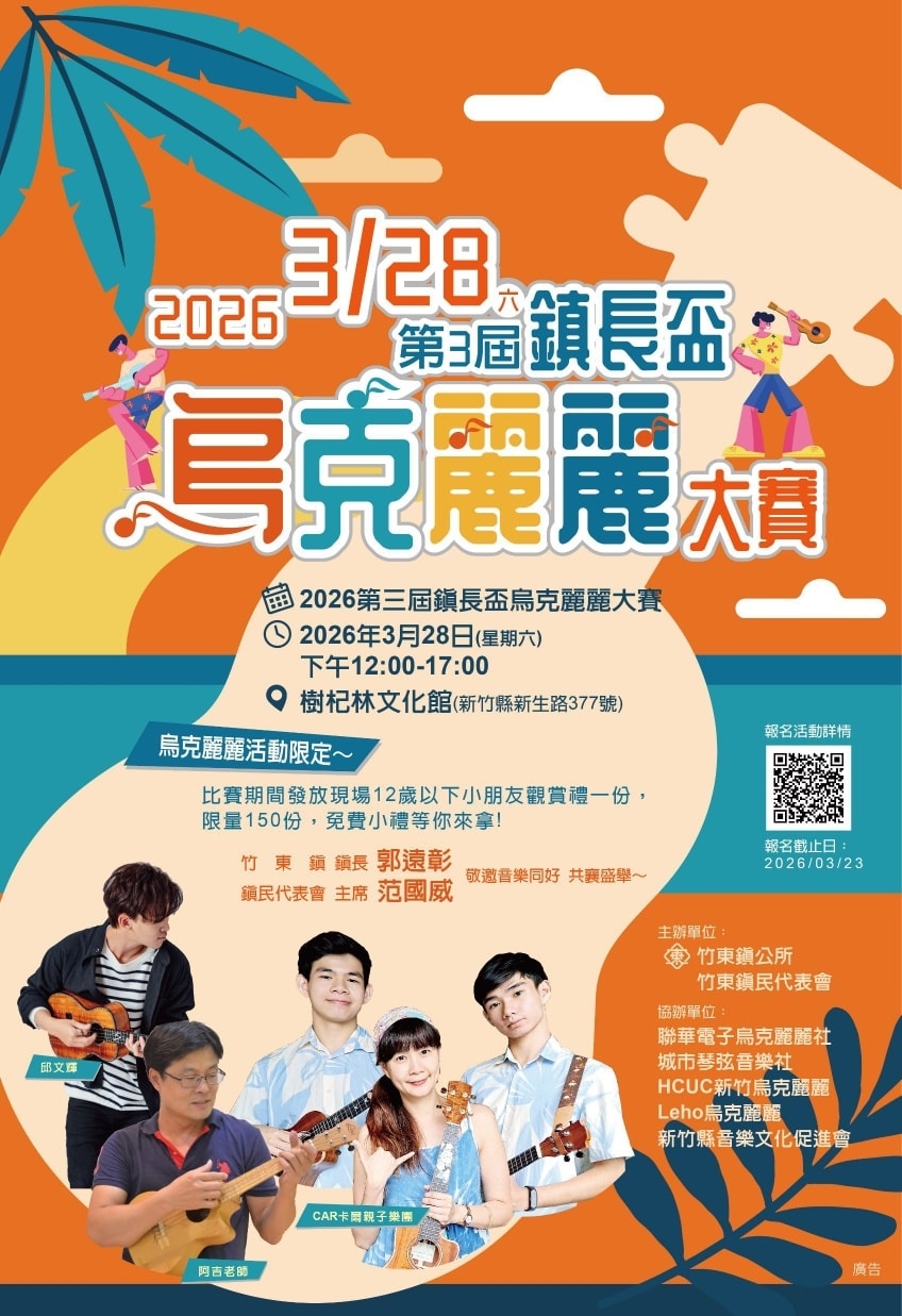「2026第三屆鎮長盃烏克麗麗大賽」將於3月28日中午12點至下午5點舉行。報名一律採Email方式(foxgirl38@gmail.com),截止日期為3月23日(週一)下午6點。詳細簡章及報名表請上竹東鎮公所官方網站查詢(網址:https://reurl.cc/ORyyxX),或電洽0928-525-443陳小姐。歡迎各界好手把握機會,一起來竹東「以琴會友」。