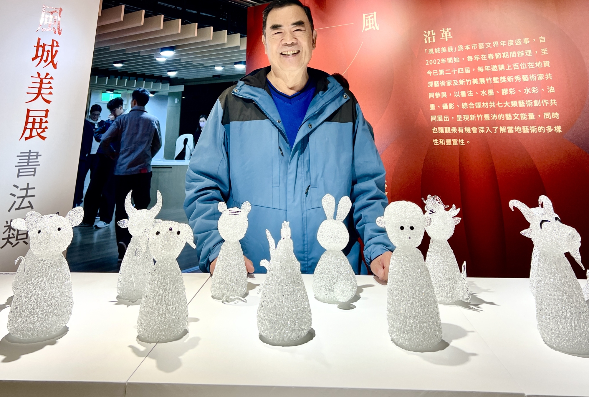 風城美展八日上午,在竹市文化局中央路241號六樓藝術空間精彩迎客,許源榮拉絲編織玻璃十二生肖創意傑作,特別吸引觀眾駐足觀賞,細品箇中奧妙,這種拉絲編織玻璃藝術,玻璃藝術創作登峰造極級的技藝,受聯合國教科文組織高度關切,啟動尋訪納文化藝術資產。