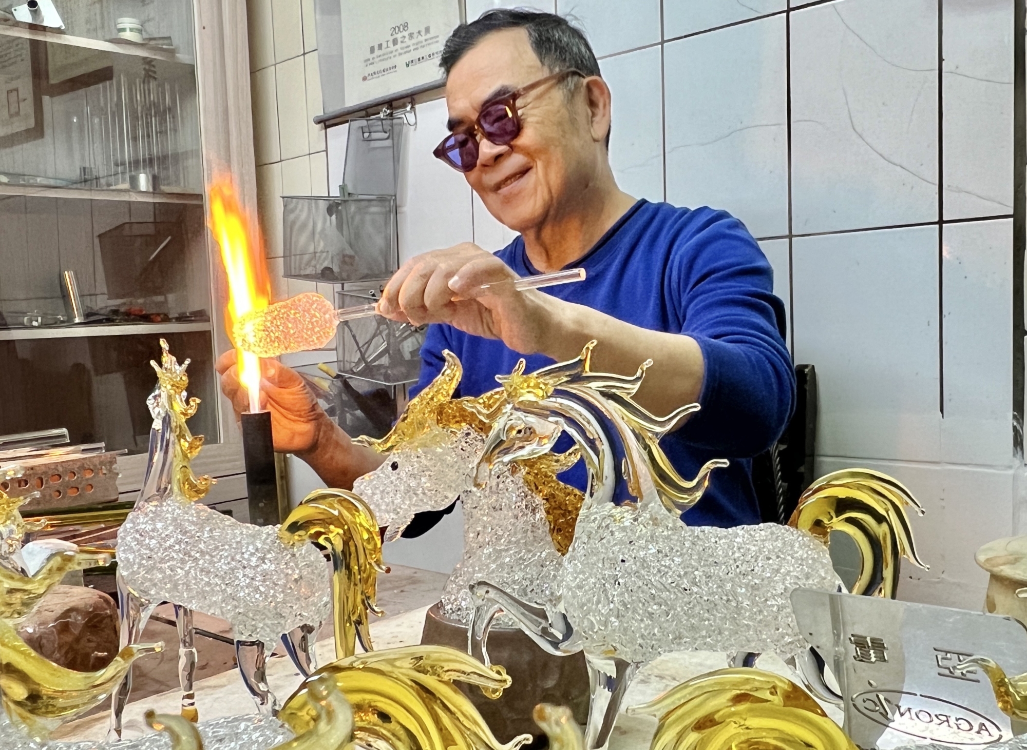 約莫20年前榮獲台灣工藝之家工藝師許源榮,在華人世界玻璃藝術競賽,創意飛馬贏得金牌獎,促使臘月間竹市華江街83號許源榮琉璃藝坊,生意興隆萬馬奔騰,忙得難以分身。