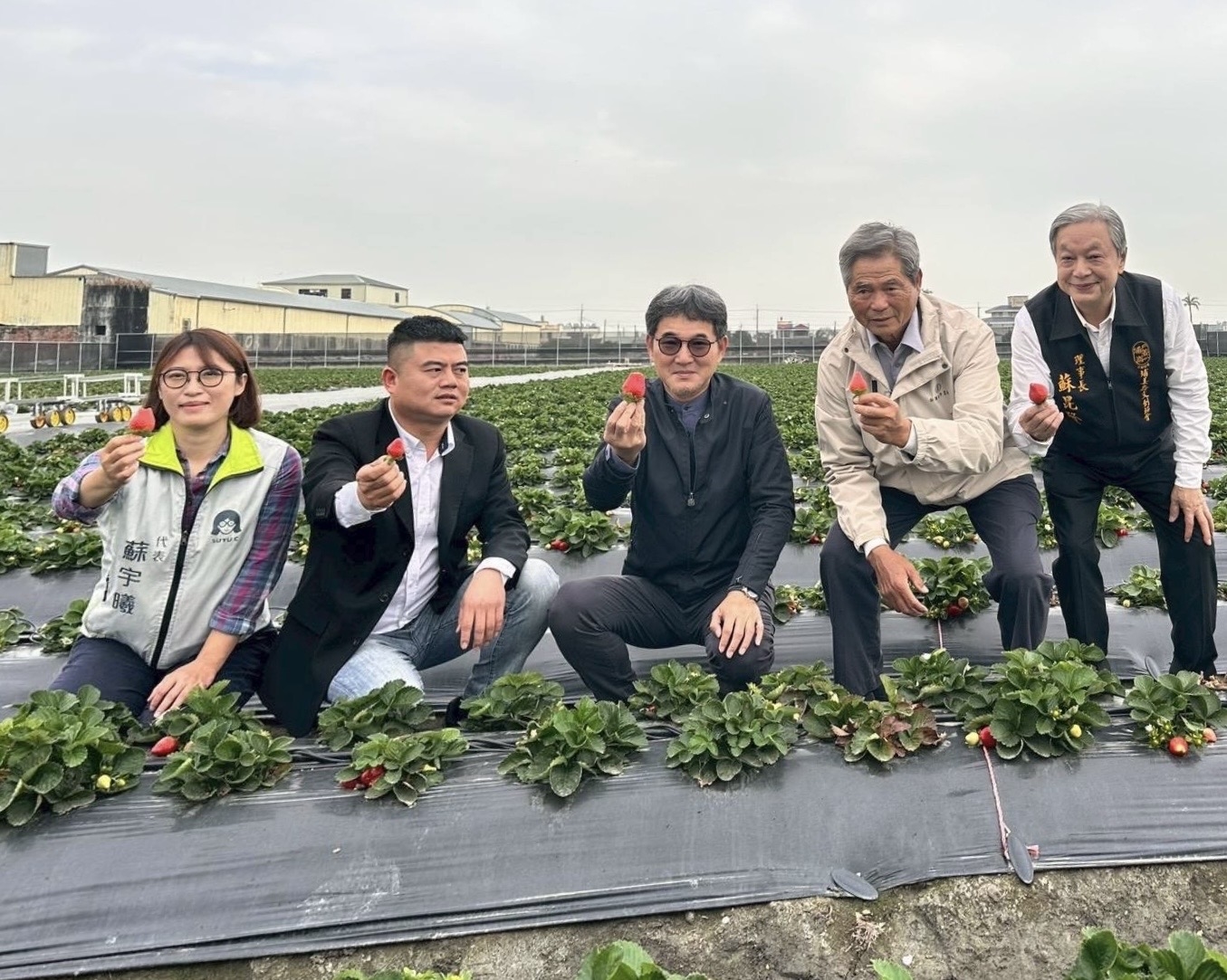 劉建國(中)強力行銷褒忠魚菜共生草莓 圖∕劉建國團隊