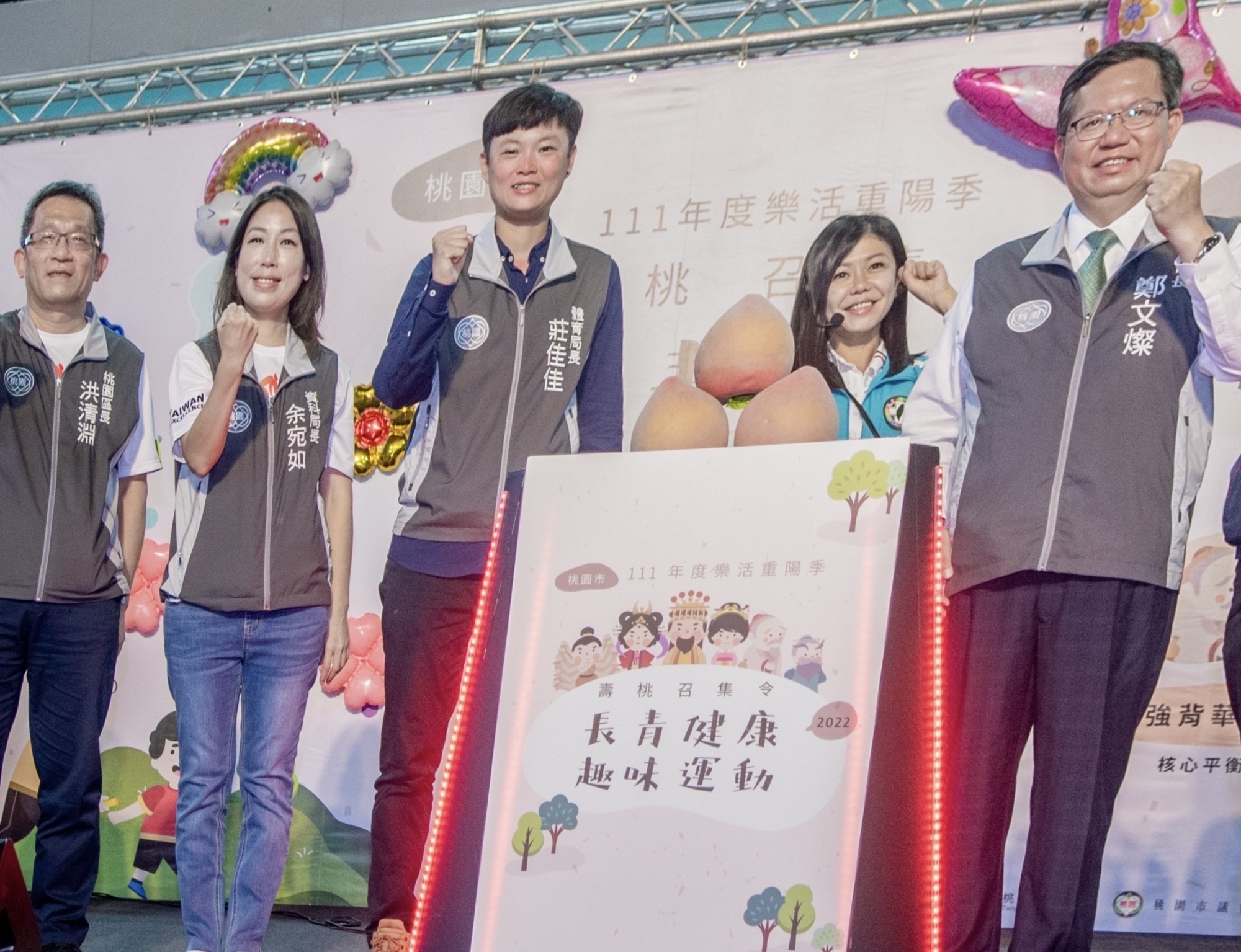 樂活重陽季桃園市長鄭文燦(右)推壽桃召集令 何高祿攝
