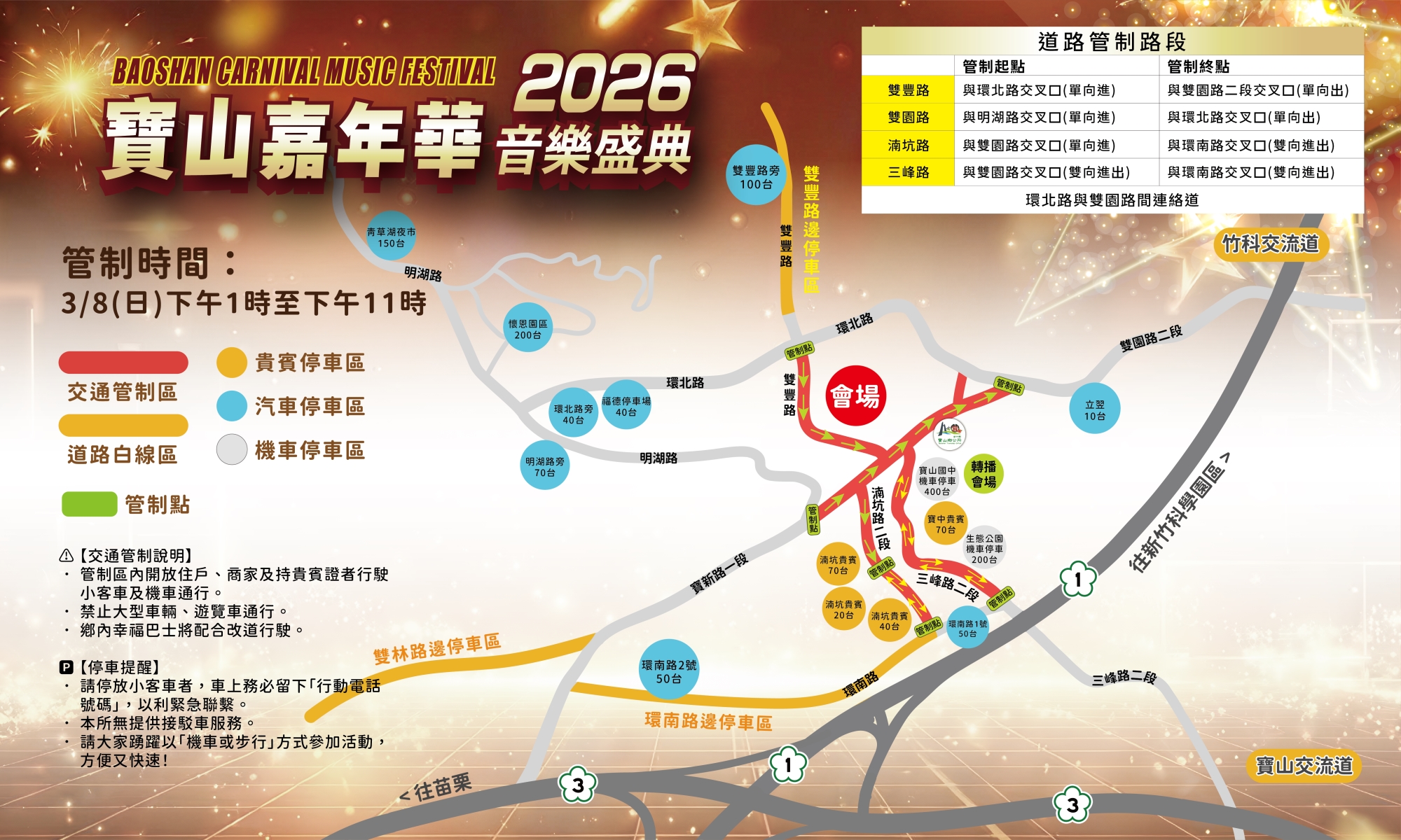 音樂、市集與人潮齊聚寶山打造最熱鬧的春日嘉年華,幾條道路中午開始已經出現堵車,「2026寶山嘉年華音樂盛典」8日在寶山盛大登場,籌辦精彩音樂演出、特色市集與歡樂氛圍中,讓寶山的夜晚熱鬧非凡,成功打造一場屬於寶山鄉親與全國民眾的春日音樂嘉年華。