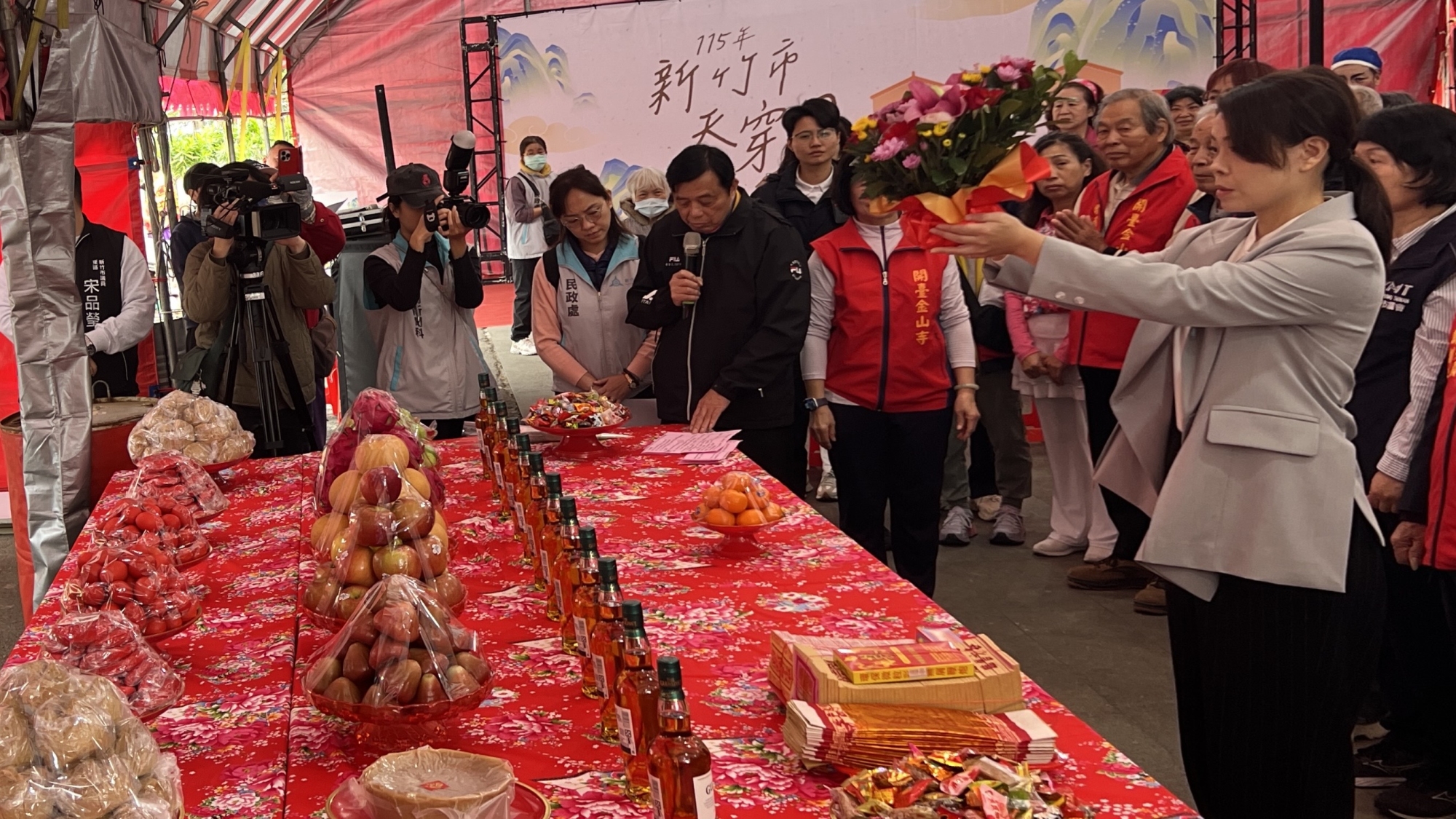 農曆正月二十日客家重要節慶「天穿日」,竹市今(8)日上午舉辦天穿日活動,於開臺金山寺舉行敬天祈福儀式,由市長高虹安擔任主獻,開臺金山寺主任委員饒圳榮、新竹市議會市議員李國璋、宋品瑩、黃美慧、段孝芳、黃文政、劉彥伶議員辦公室主任劉聲正、陳啟源議員服務團隊,及多位客家事務委員及客家社團理事長、各界貴賓擔任陪獻,與市民朋友一同敬天祈福,祈求新的一年風調雨順、國泰民安。