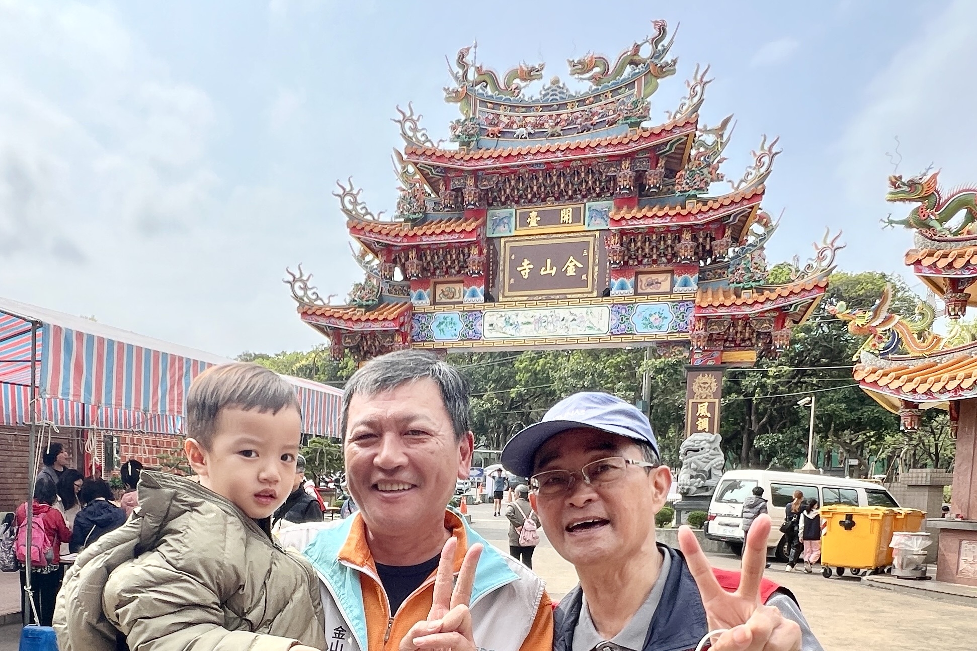 金山寺財務楊元勛和金山里里長饒彬義,為隆重舉辦古禮天穿日祭祀,整個春節全力全心投入,順利圓滿完成祭典,在金山寺金字牌樓前,謝天謝地開心的迎送賓客。
