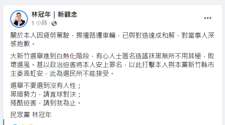 竹北市長參選人林冠年涉及酒駕還硬拗政治迫害,企圖否認,警方發出聲明打臉。(翻攝自林冠年臉書)