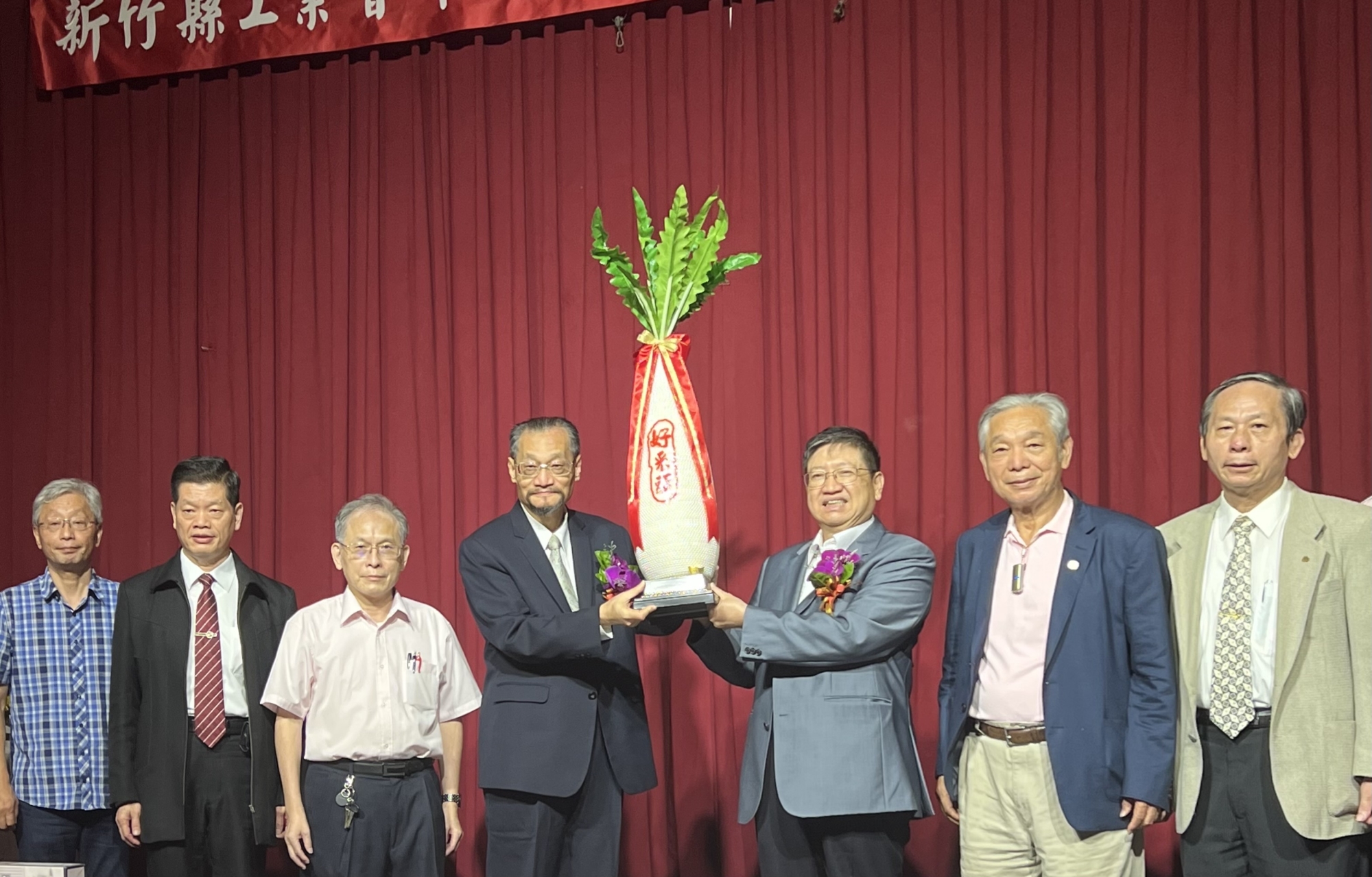 新竹縣工業會理事長呂理展(左四)致贈好彩頭給楊文科(右三),祝福他順利連任。 何高祿攝