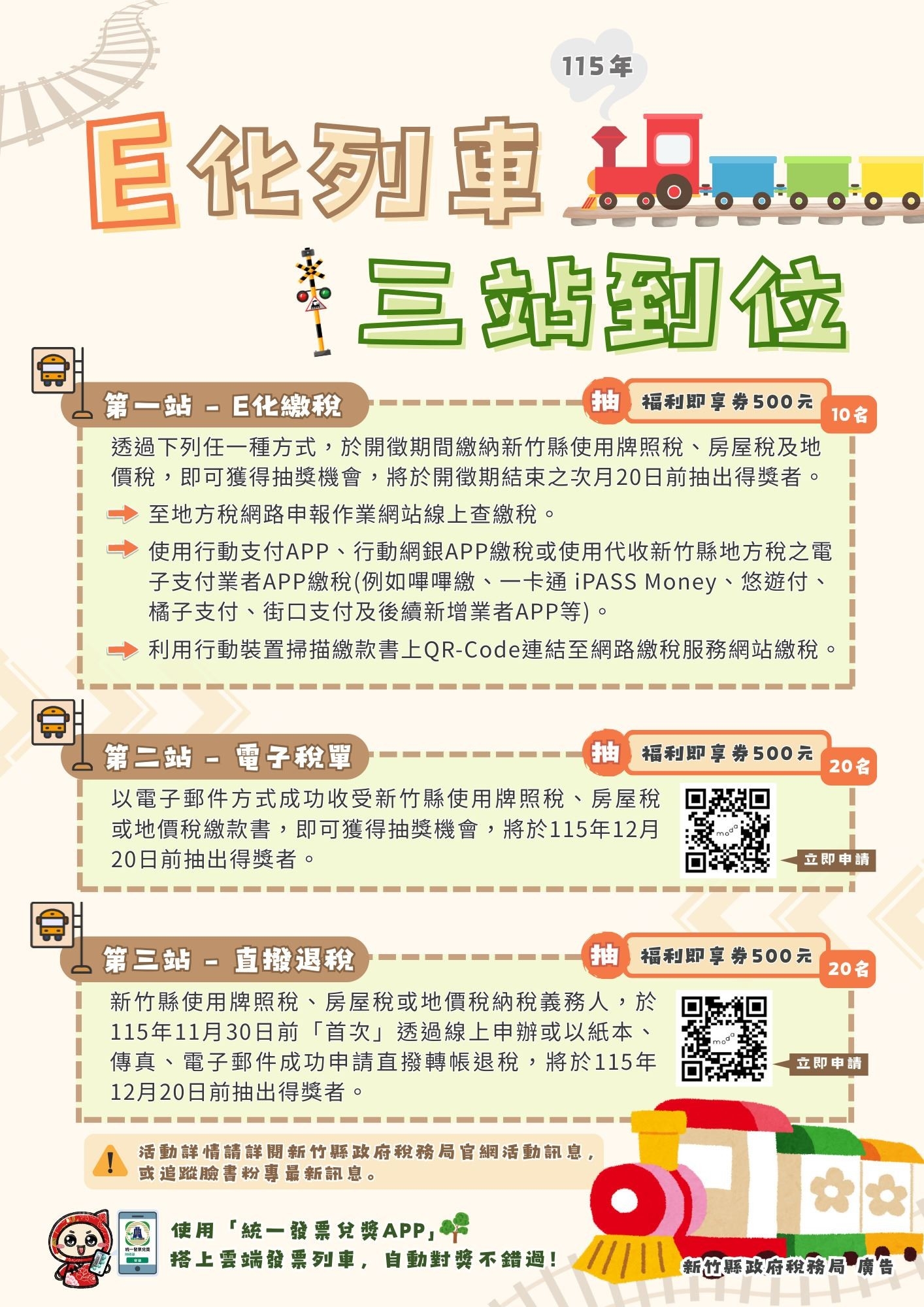 115年房屋稅將於5月開徵囉!新竹縣政府稅務局提供多種便利又快速的E化繳稅方式讓民眾方便繳稅,若您使用E化方式如電子支付及行動支付APP繳稅或是登入「地方稅網路申報作業」網站進行線上查繳稅,還可以參加「E化列車 三站到位」抽獎活動,將有機會抽中500元禮券喔!