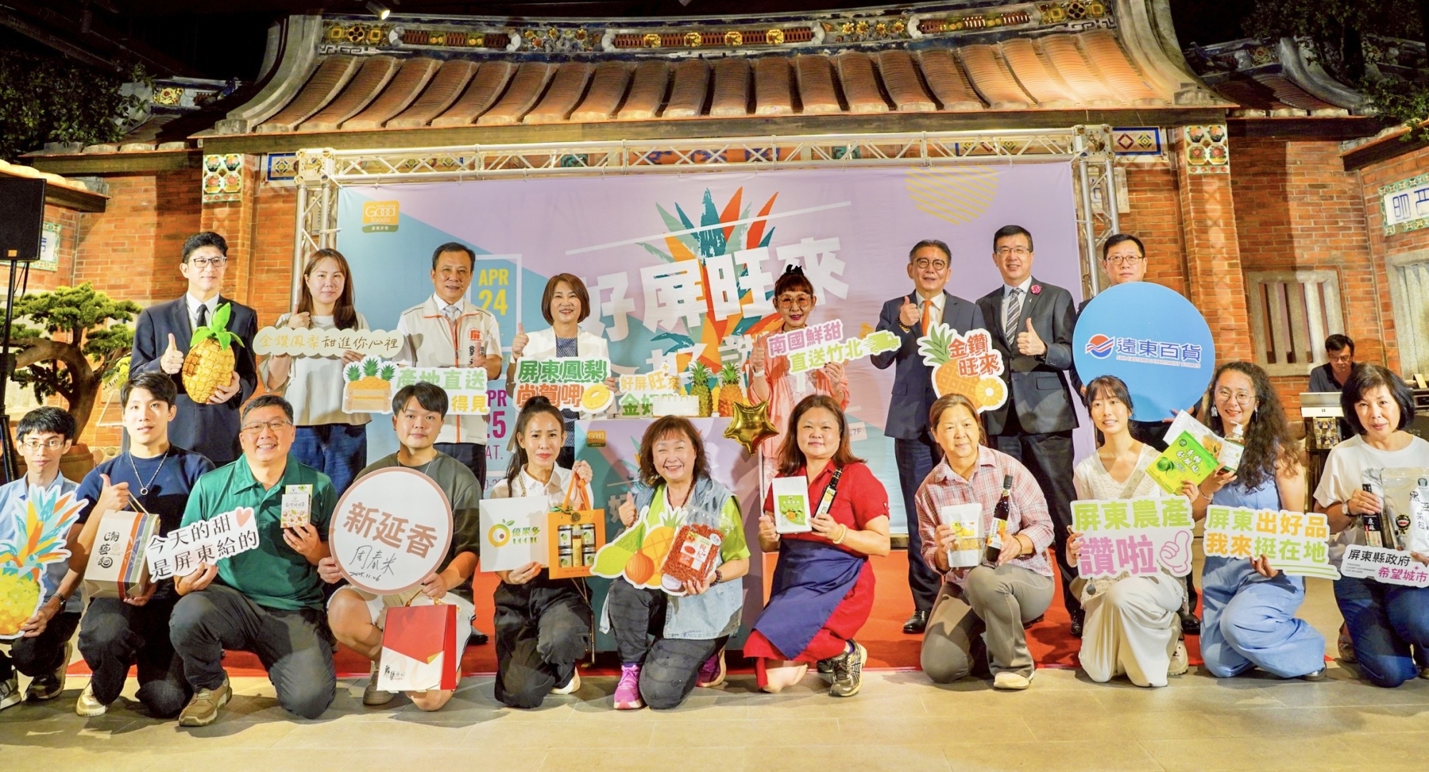 為推廣屏東優質農特產品及提升屏東農產品牌形象,屏東縣府於24日至4月26日共三天在遠東百貨竹北店舉辦「好屏旺來金好讚」屏東農產行銷活動,以屏東代表性農產品「金鑽鳳梨」為主題,結合農產品展售、舞台活動及互動體驗,打造城市型農產行銷平台。