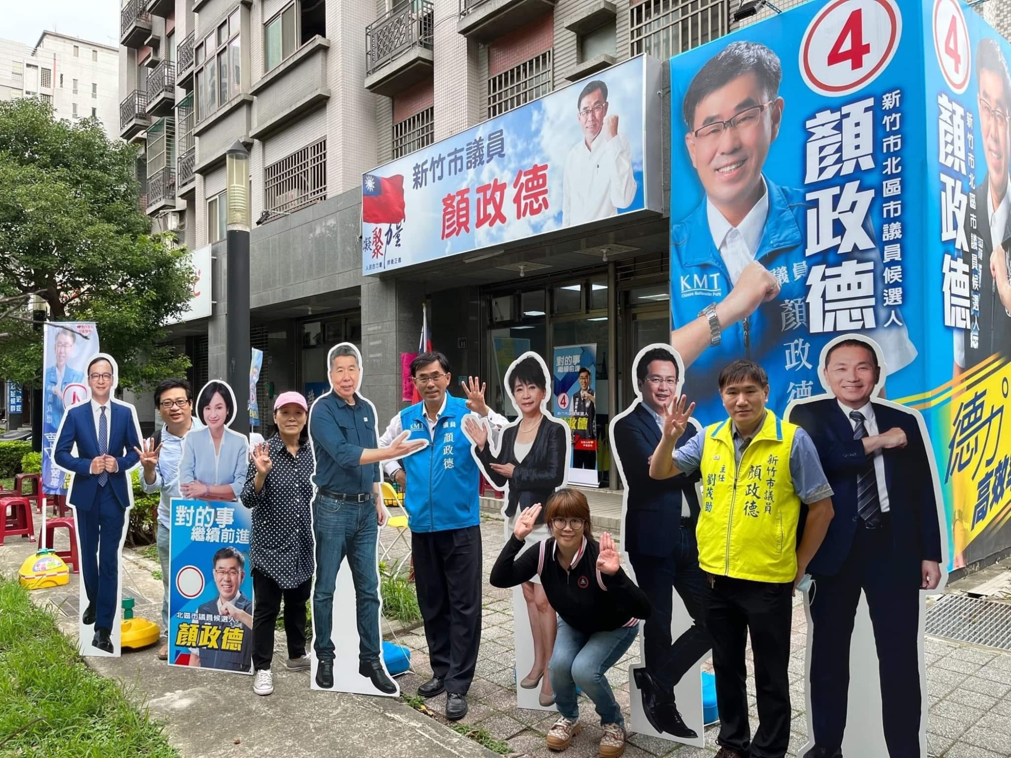 新竹市議員顏政德製作藍營大咖人形立牌,意外成為打卡拍照景點。(翻攝顏政德臉書)