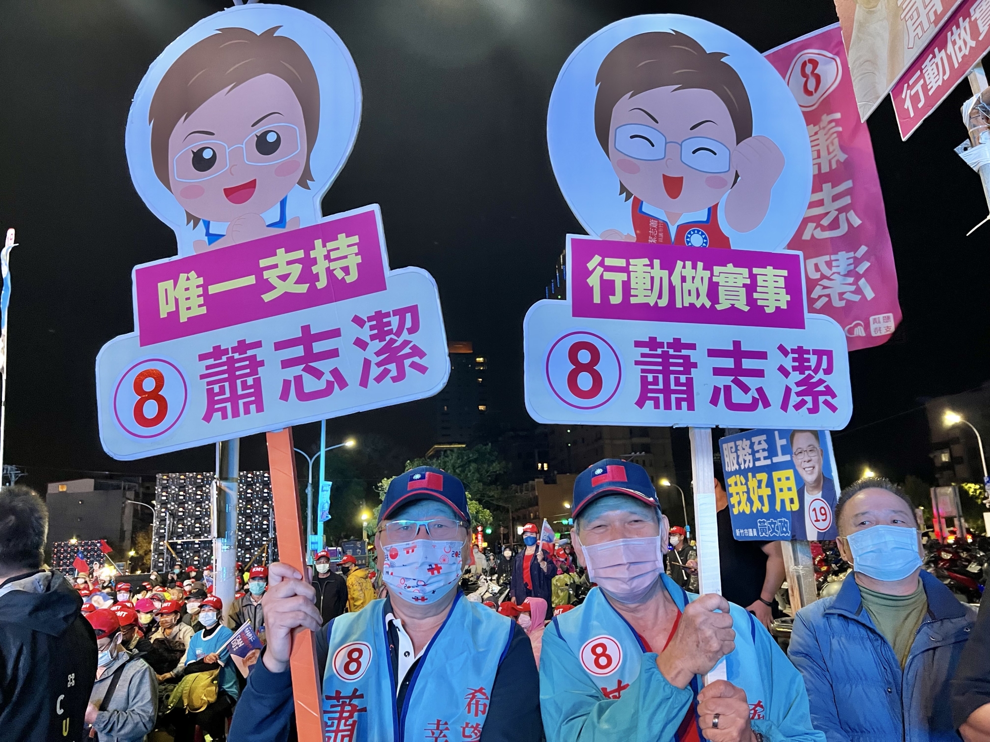 會場有一對父子手持同樣候選人的Q版牌,顏色文字全部相同,一位在人群中,另一和朋友在會場邊上比肩而立,持牌非常專業,人動、Q版牌不動,表現相當忠心,他們不二,手上立的牌子是唯一支持。市議員候選人北區8號蕭志潔,是兒子的媽咪,父親的牽手。