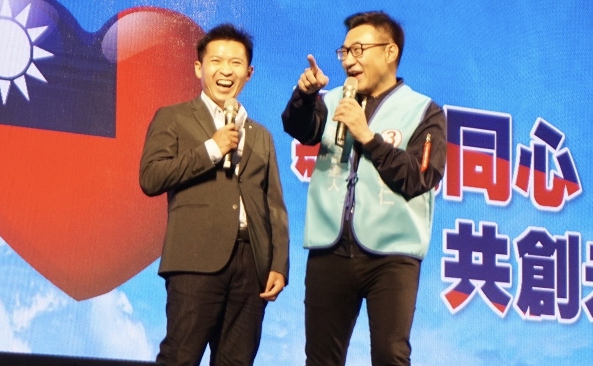 台上突然唱起雙簧,出現輕鬆畫面,台北南下拉抬聲勢的前國民黨主席江啟臣,衝著竹市東區市議員候選人11號何志勇,說了一些往事,還加了通關密語,結果往事都說清楚了,通關密語忘了。