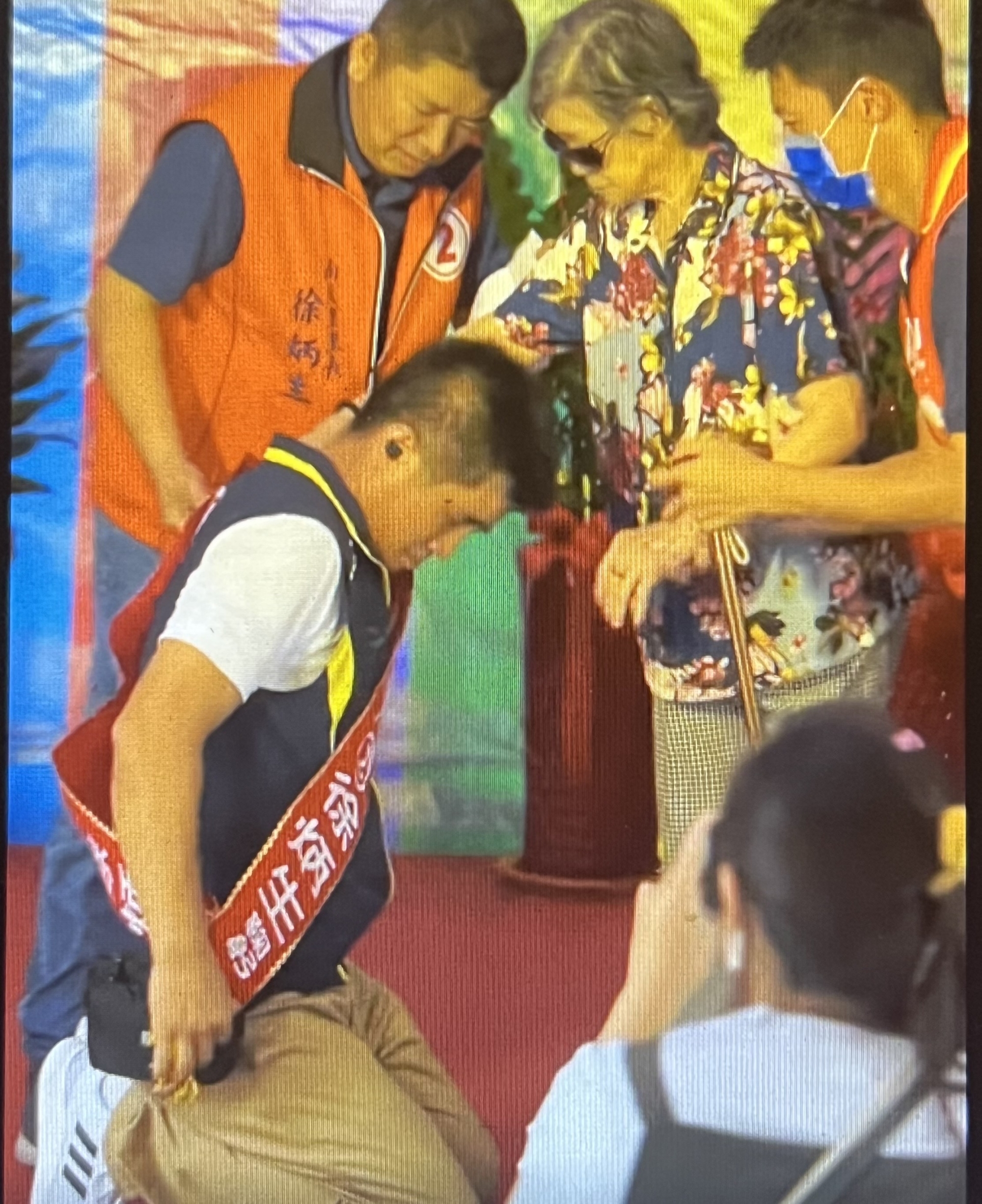 會場裡大家說說笑笑,但看到事母至孝的徐炳生跪下來,接受九十多歲老媽媽披上彩帶,不知道為什麼?大家的眼眶都紅了起來!